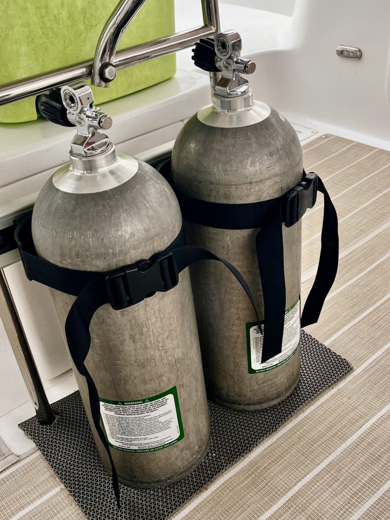 Wir starten heute das Unterfangen, neue Tauchflaschen zu besorgen. Die alten schultern wir buckelnd zum Tauchshop, die dürfen wir dort abgeben. Die neuen, nun aus Aluminium und etwas kleiner, werden frisch befüllt, Klaus’ undichtes Ersatzmundstück überprüft, Dichtungen erneuert und alles wieder in unsere stabilen Seerucksäcke verpackt. Glücklich schleppen wir alles wieder an Bord.