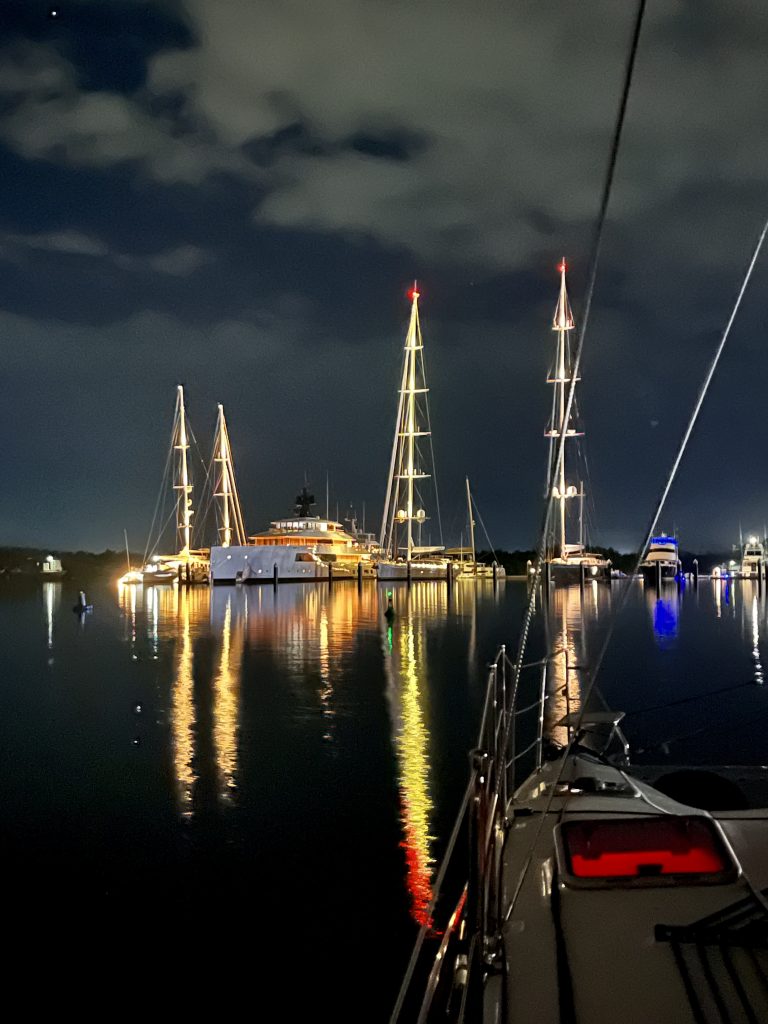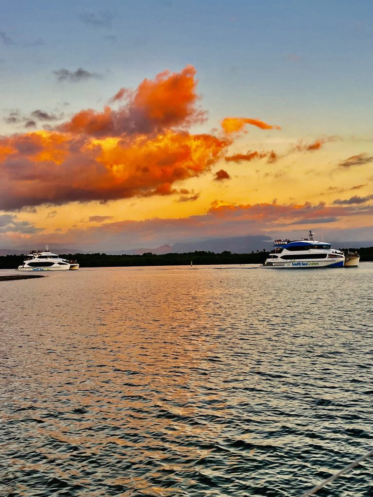 Ist ja nett! Das ist der australische Colonel mit seiner Frau. Die hatten wir doch schon in der Lau-Gruppe angequatscht. Jetzt sind sie aber just nicht an Bord, das Dinghy ist weg. Na, dann genießen wir jetzt noch ein bisschen die Abendstimmung.