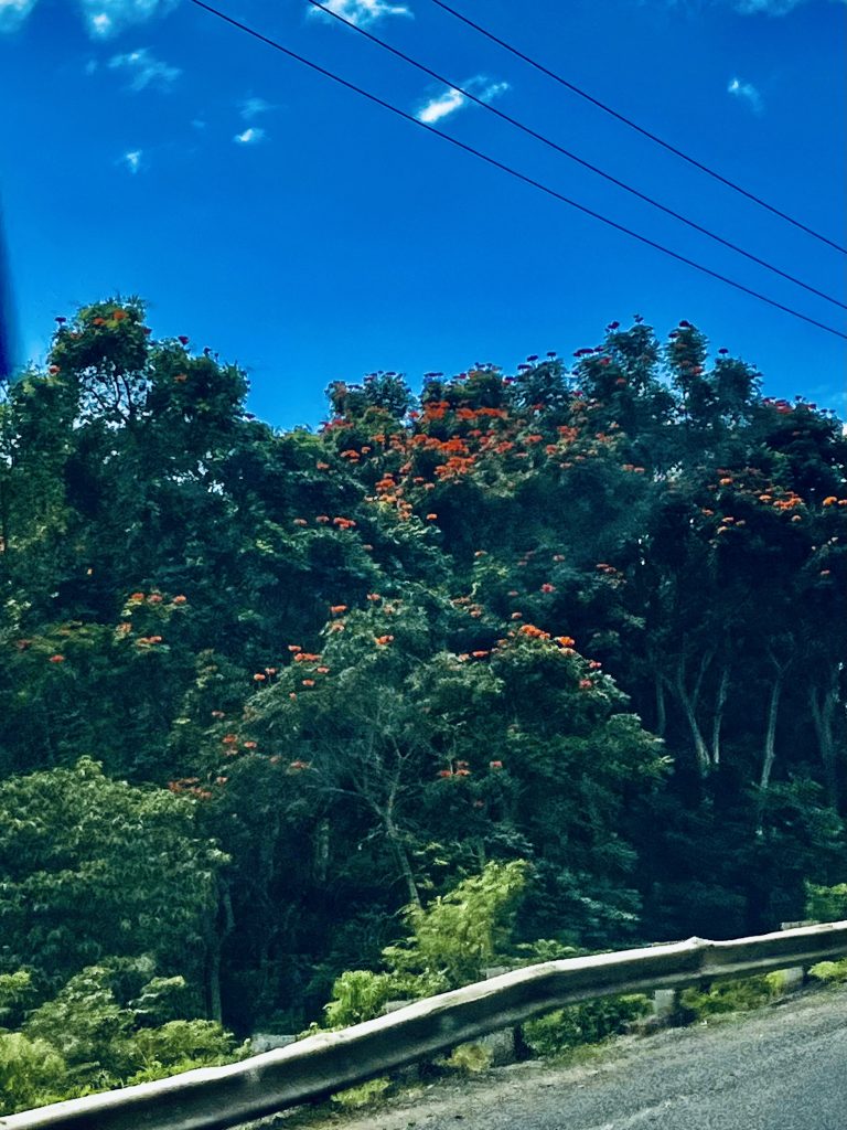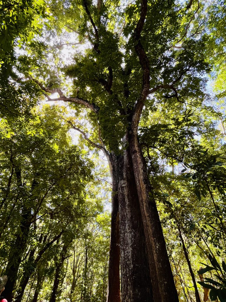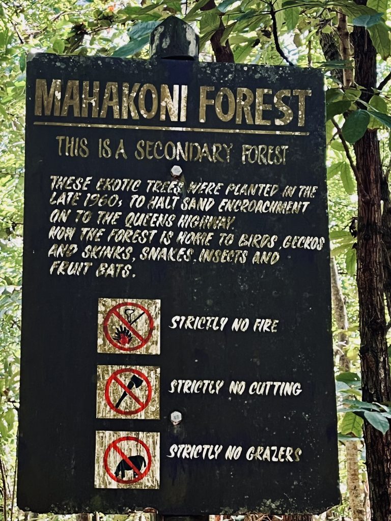 Sogar ein Stück betonierten Weg wandern wir gleich entlang, genauso wie es uns der Guide beschrieben hatte, und dann erreichen wir den Mahagoni Wald.
