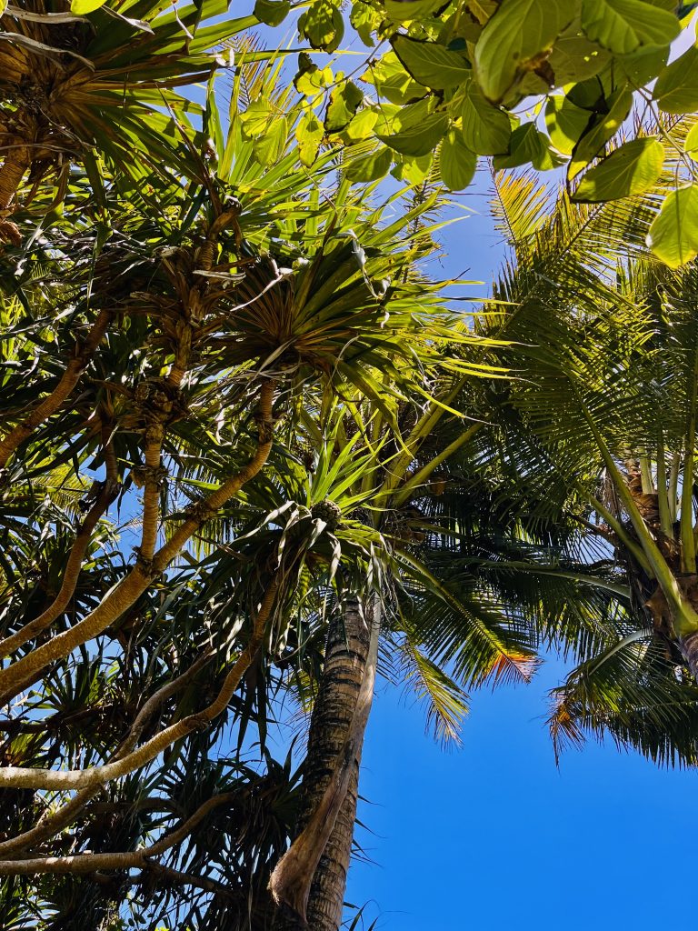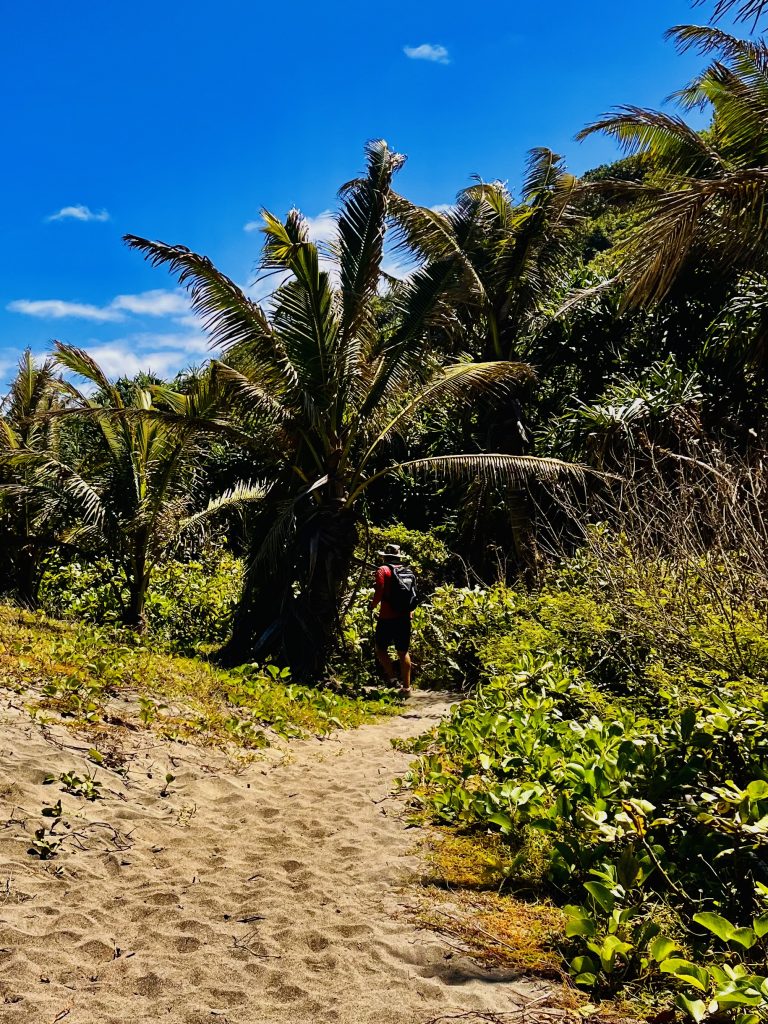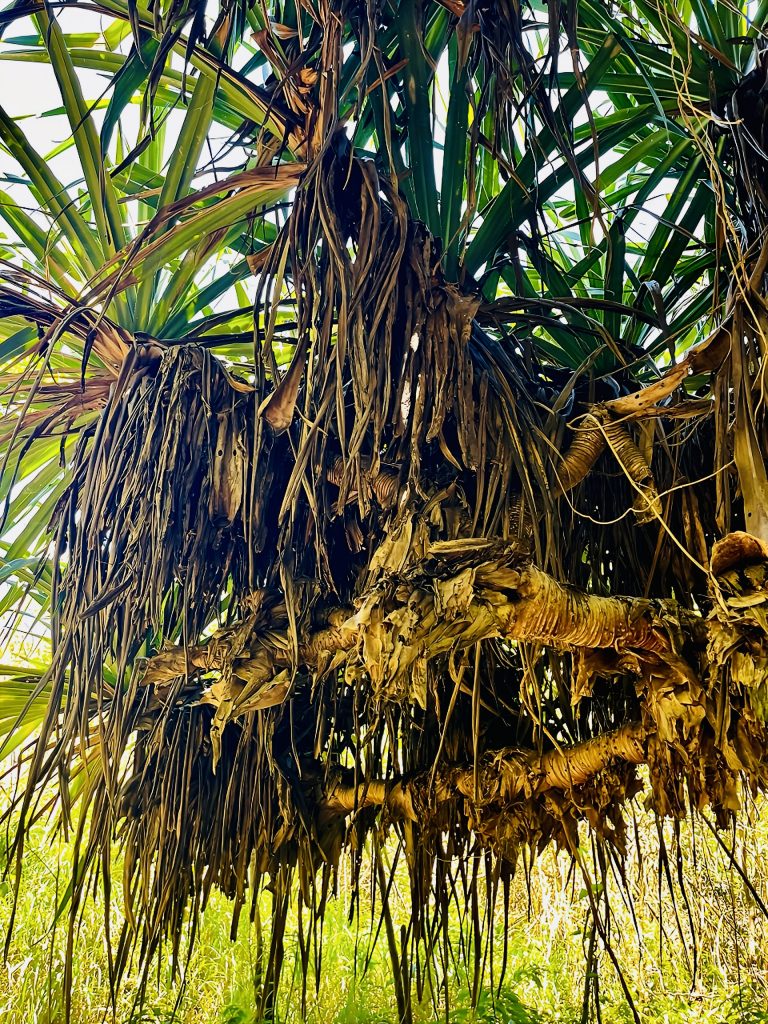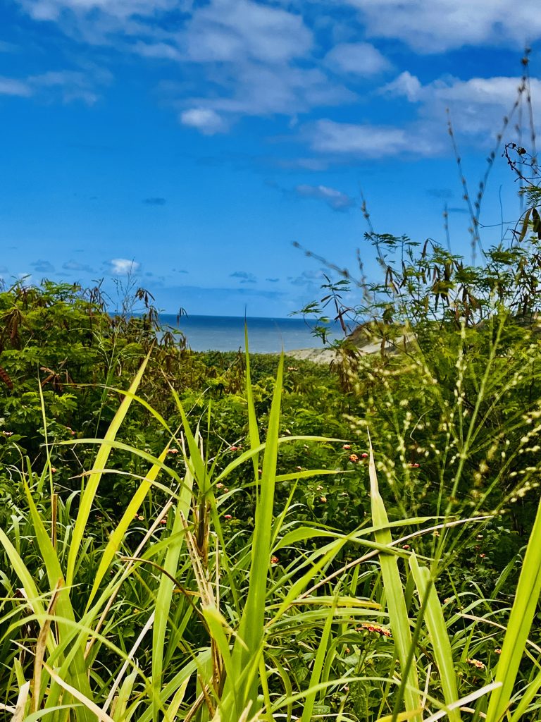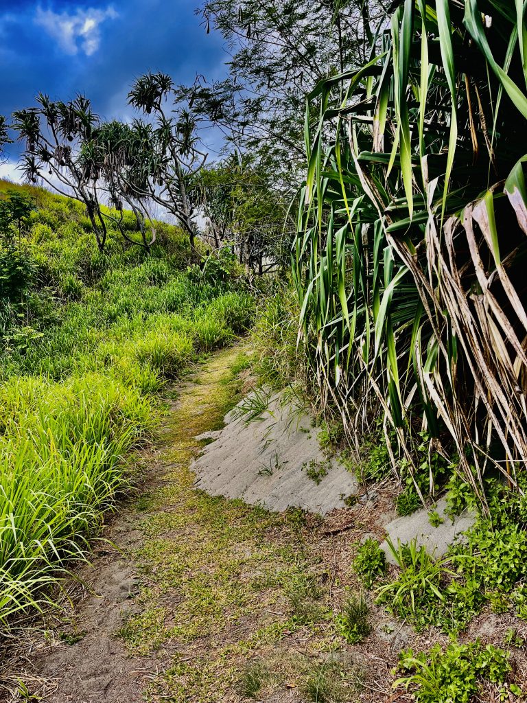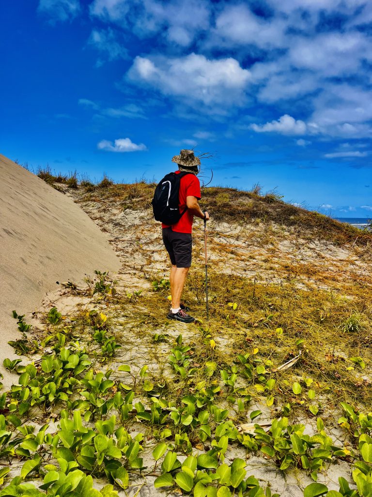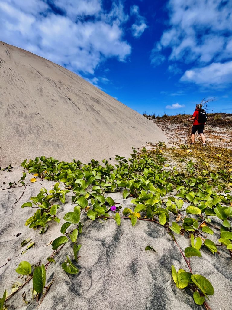 Wir laufen praktisch die Feuerschneisen entlang und zunächst mal über die statischen, bewachsenen Dünen. Gräser, Buschwerk, Palmen und niedrige Bäume halten den Sand zusammen und an Ort und Stelle.