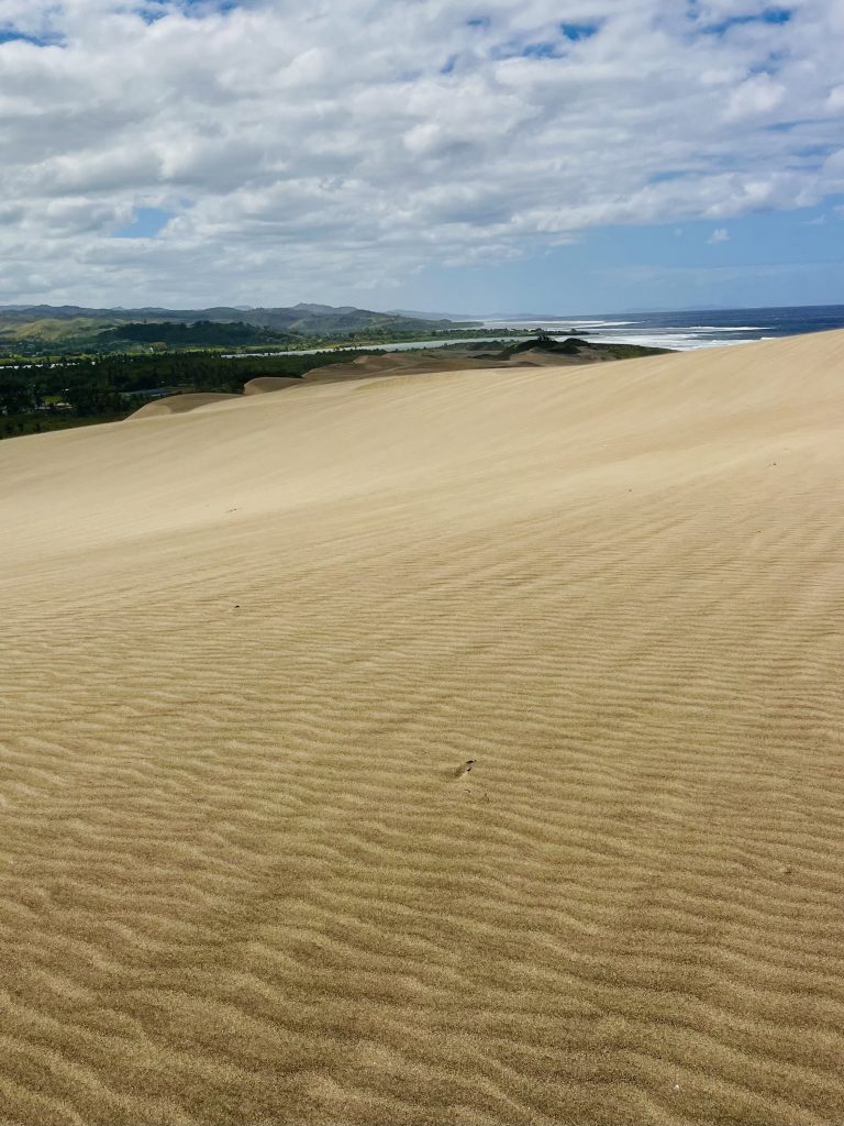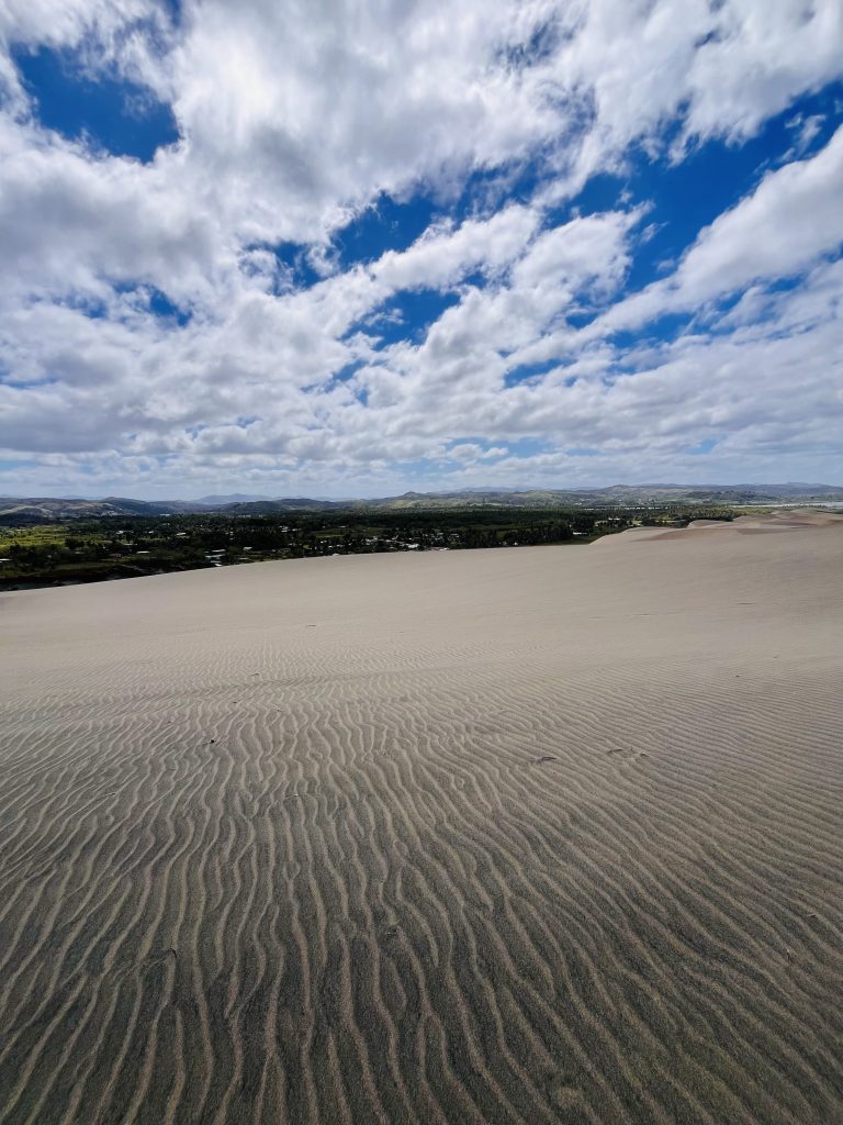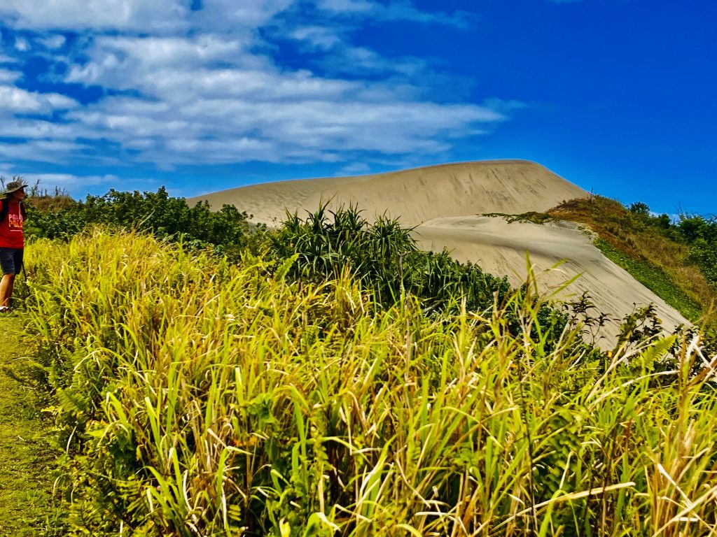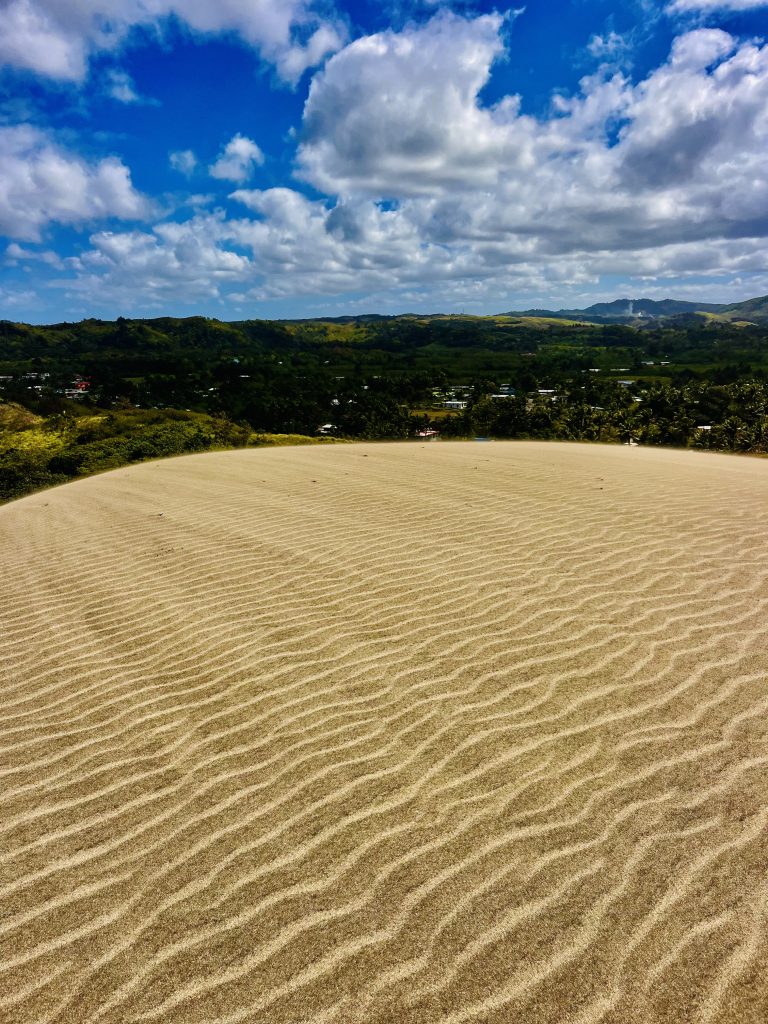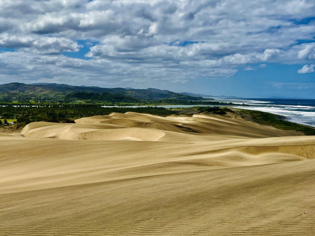 Sie wandert nicht schnell, jedes Jahr nur ein ganz klein bisschen. Aber dadurch wird über die Zeit immer mehr Vergangenheit freigelegt. Unter uns befinden sich nämlich ein Dorf der ersten Bevölkerung Fidschis. Überreste der 1.000 vor Christus siedelnden Lapitas kommen mehr und mehr ans Tageslicht. Töpferscheiben, Pfeilspitzen, Grabgebeine konnten schon geborgen werden. Davor war dieses Gebiet von tropischem Regenwald bedeckt. Die Lapitas holzten mehr und mehr ab, die Gegend versandete, das Meer brachte immer weitere Sandmassen an Land, und der Wind tat sein Übriges.