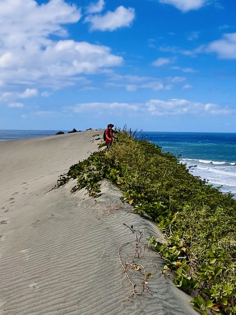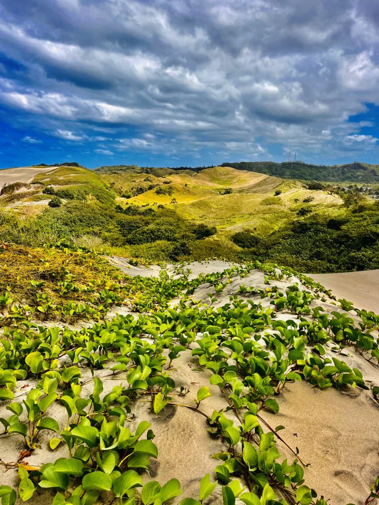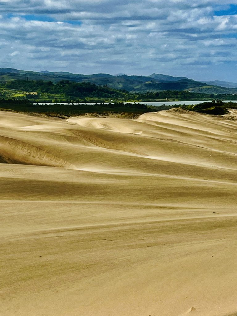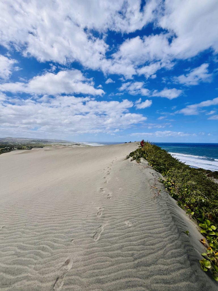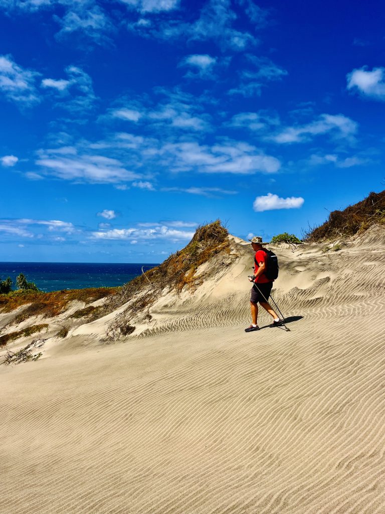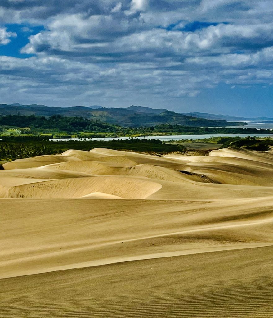 Sie wandert nicht schnell, jedes Jahr nur ein ganz klein bisschen. Aber dadurch wird über die Zeit immer mehr Vergangenheit freigelegt. Unter uns befinden sich nämlich ein Dorf der ersten Bevölkerung Fidschis. Überreste der 1.000 vor Christus siedelnden Lapitas kommen mehr und mehr ans Tageslicht. Töpferscheiben, Pfeilspitzen, Grabgebeine konnten schon geborgen werden. Davor war dieses Gebiet von tropischem Regenwald bedeckt. Die Lapitas holzten mehr und mehr ab, die Gegend versandete, das Meer brachte immer weitere Sandmassen an Land, und der Wind tat sein Übriges.