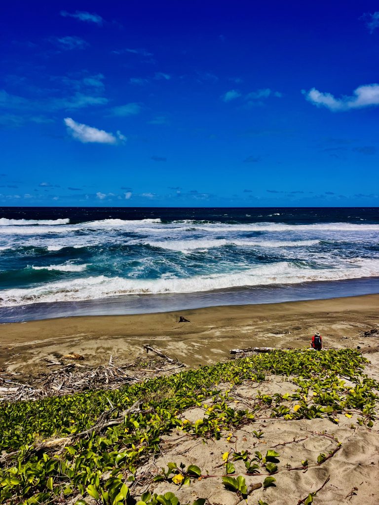 Da sitzt er, da unten am Strand und blickt aufs tosende Wasser. So sieht das nämlich aus, wenn kein Riff die Wellen bremst. 🌊