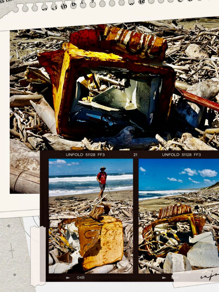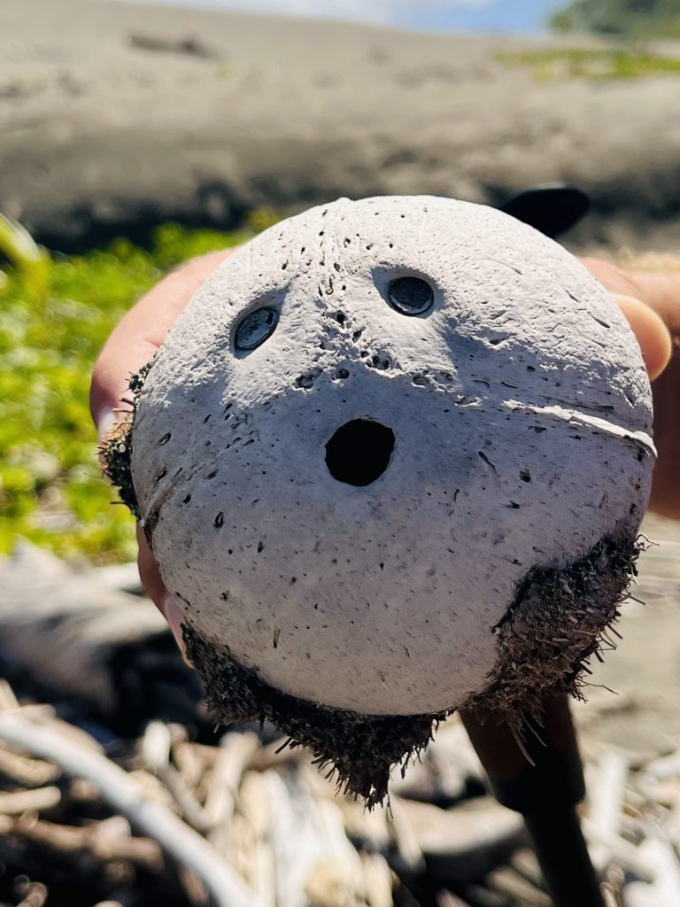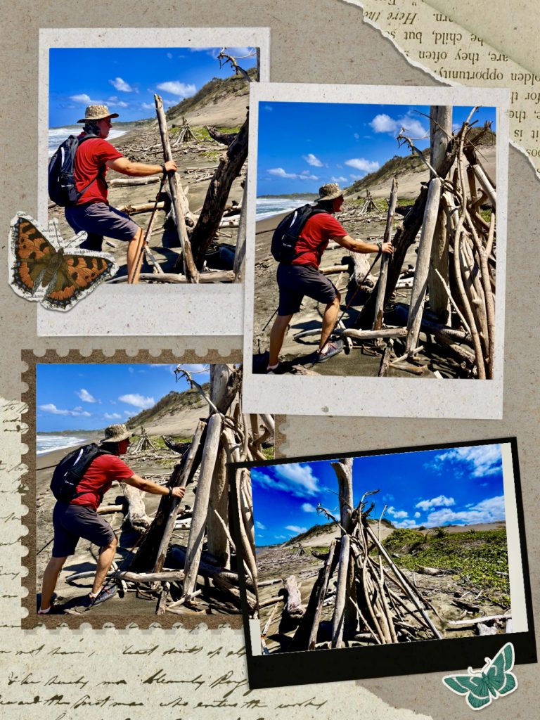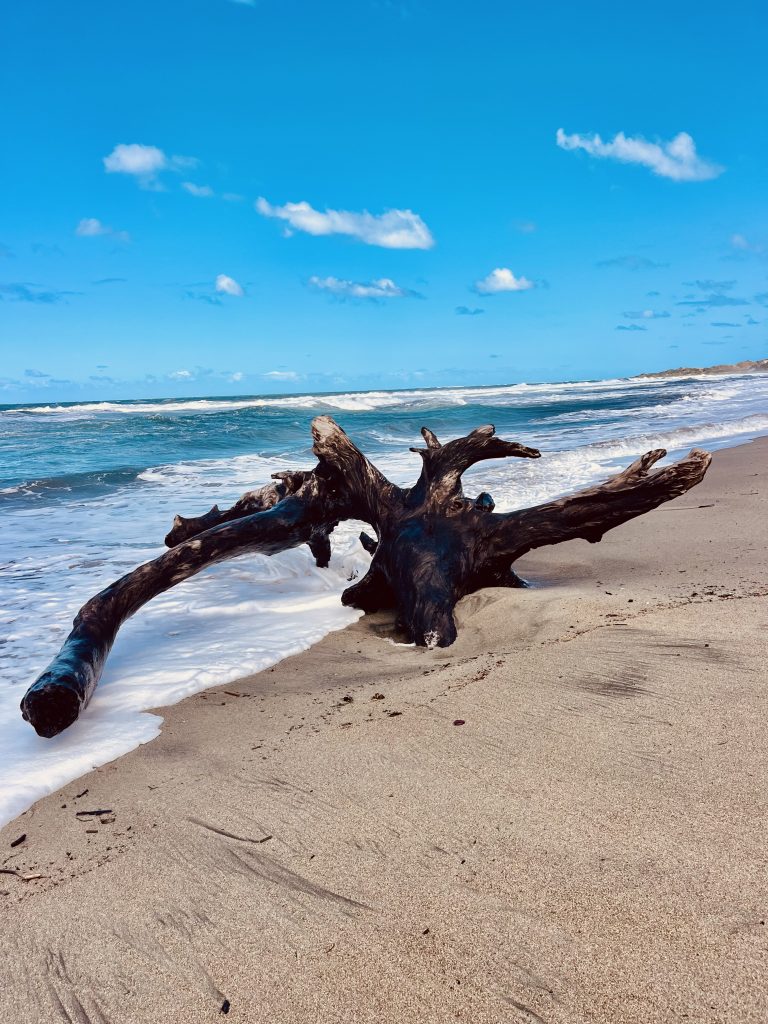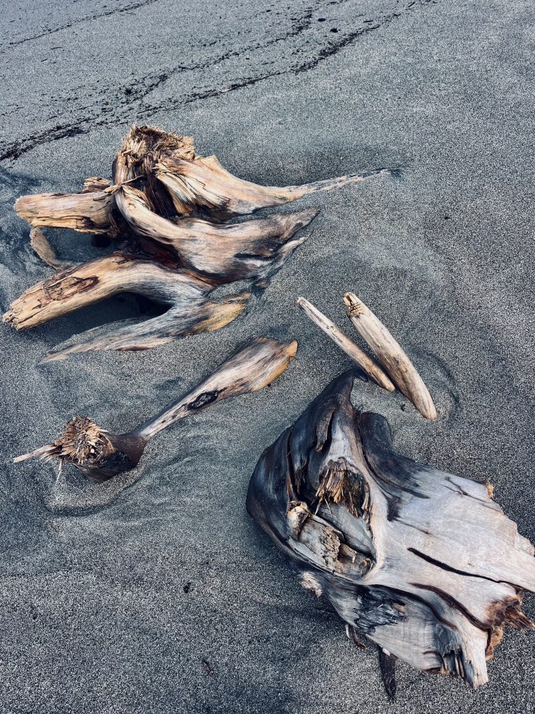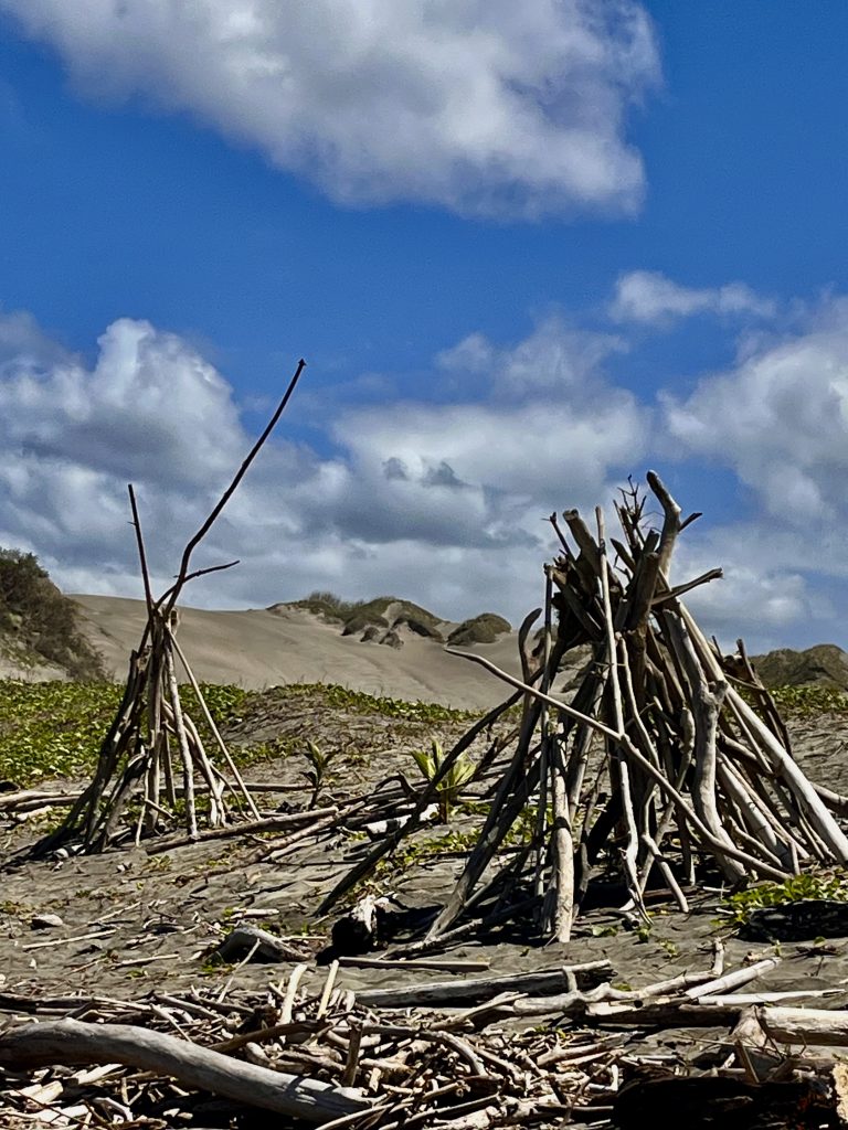 Jetzt geht es über den Strand zurück zum Ausgangspunkt. Wir kommen an vielen, aufgestellten Tipis vorbei und allerlei angeschwemmtem Strand“gut“.