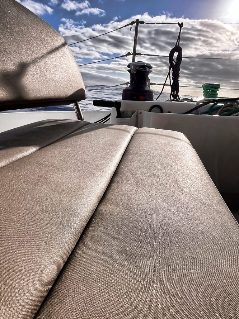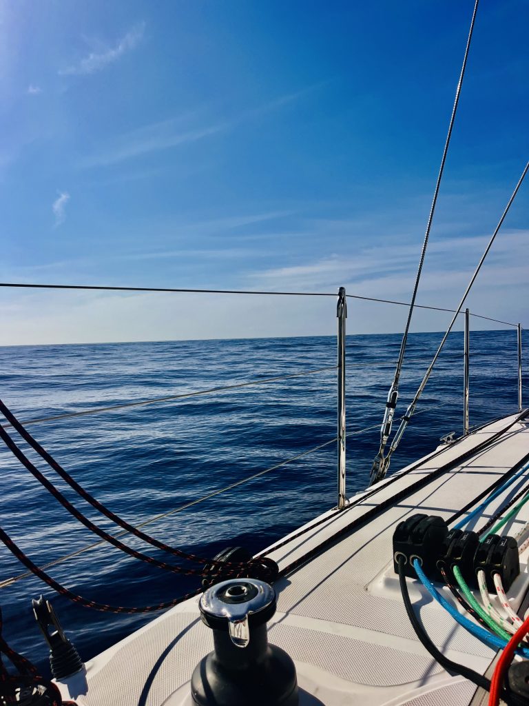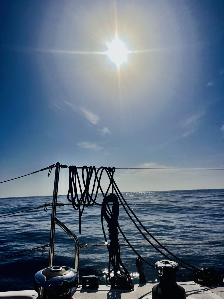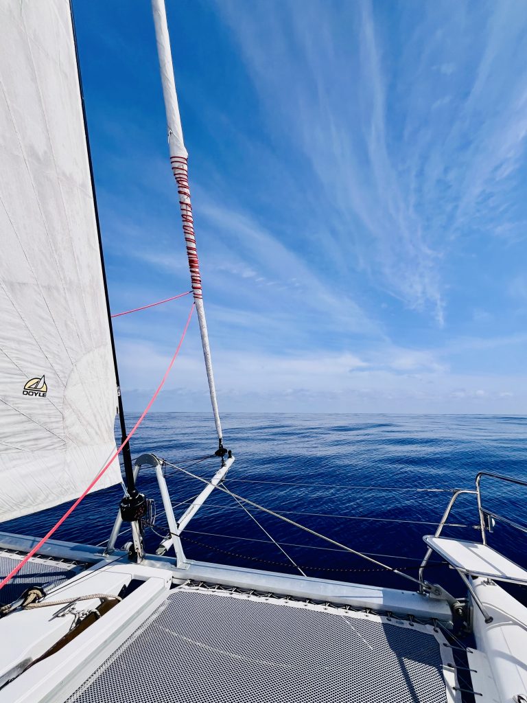 Mit Nichten! Wir lieben es❣️Genug Platz unter uns, keine Riffe, keine Untiefen und genug Platz um uns herum. Keine anderen Boote, keine Frachter, keine Fischer, herrlich❣️Blauer Himmel, strahlende Sonne, keine kackenden Seevögel, toll❣️Der Wind ist doch nicht völlig zum Erliegen gekommen und säuselt immer noch leicht. Es reicht sogar ohne Motor voranzukommen, das Screecher macht seinen Job gut. Ein Genuss❣️