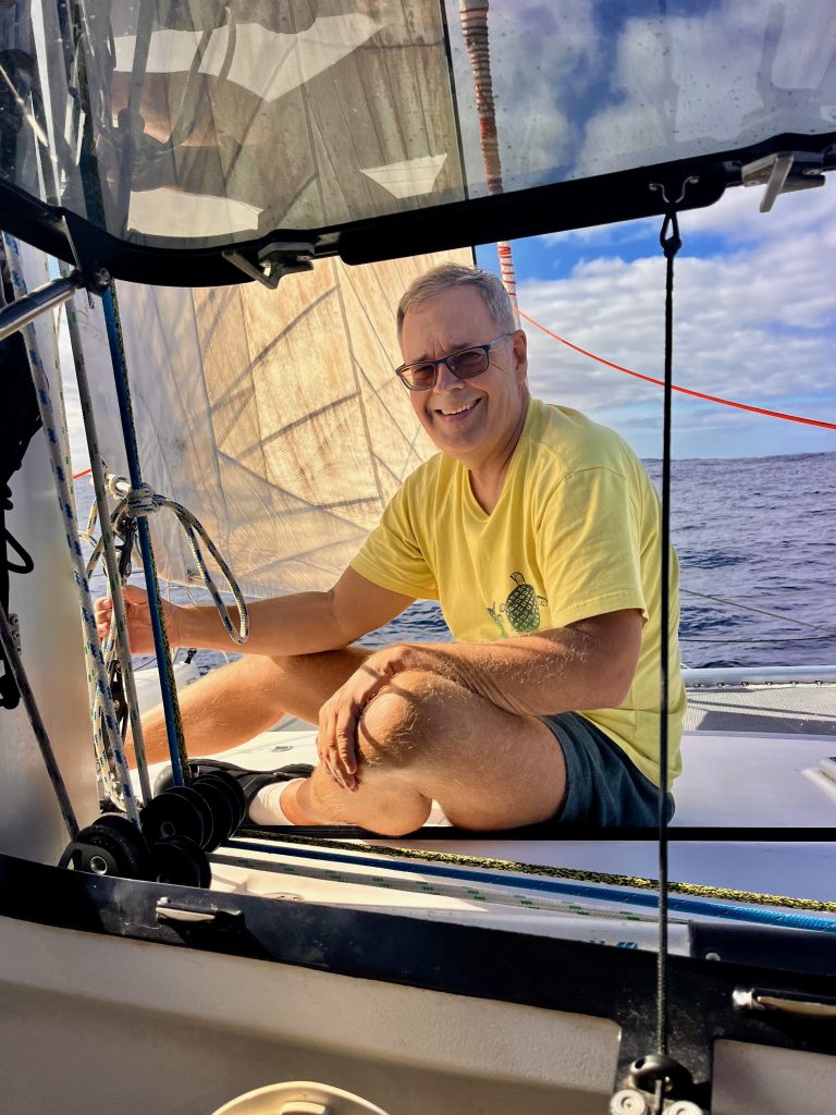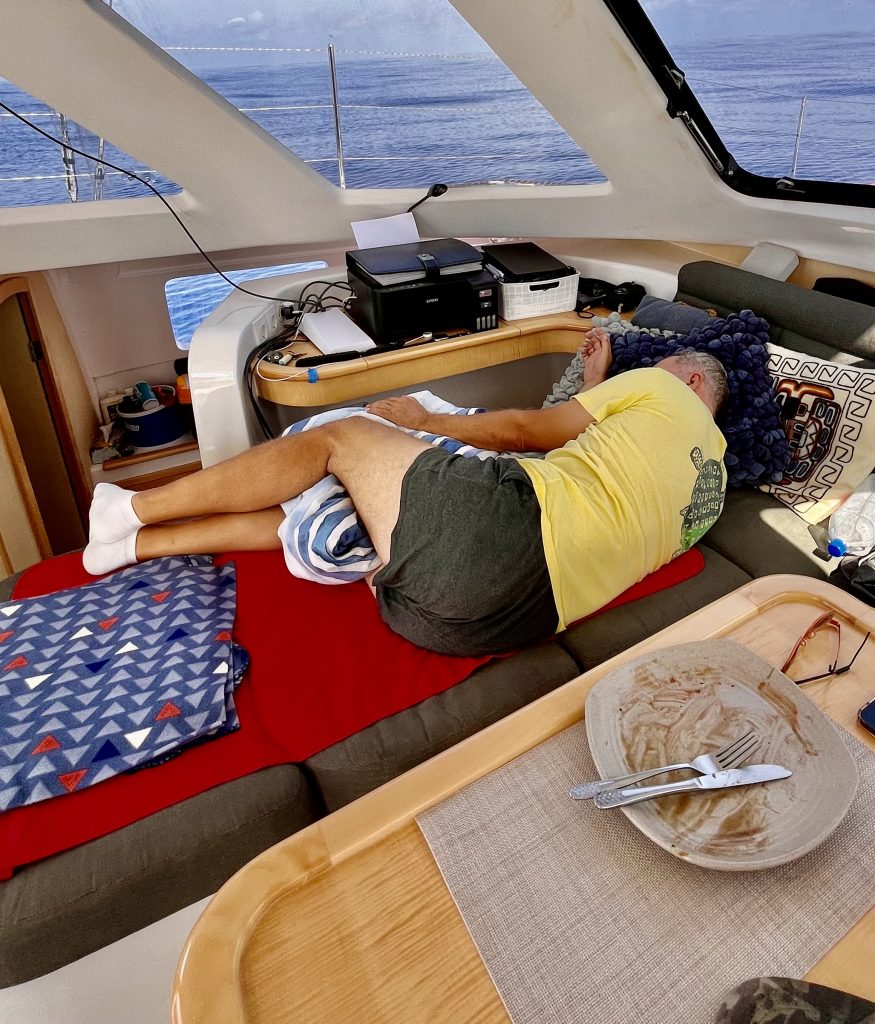 Dabei ist es gar nicht so leicht den Halteblock herauszunehmen, während das Segel im Wind steht. Wir sind noch nicht einmal dafür abgefallen, was die Sache definitiv erleichtern würde. Keine Lust… Aber mit vereinten Kräften und einer Halteleine ist dieser Teil der Operation erfolgreich vollbracht. Nun geht’s hoch aufs Dach. Ach herrje, das Großfall hat sich schier unlösbar mit der Dirk verwickelt. Es sieht sogar nach einem derben Knoten aus, was physikalisch gar nicht sein kann. 🤔 Für das Turnen und Fummeln auf dem Dach, haben wir Yuti jetzt aber doch umgedreht. Dennoch hat Klaus große Mühe, die enge Leinenverbindung zu lösen. Es gelingt auch erst, als wir den Baum auf einen unserer dicken Fender ablegen und so die Dirk lockern können. Jetzt erst kann der Block vom Jib an das Großfall montiert werden. Auf jeden Fall ist das Groß nun wieder einsatzfähig. 👏 Yuti wird wieder gewendet, auf Kurs gebracht, das Jib eingeholt und das Screecher herausgelassen. Der Motor kann endlich mal wieder pausieren. Leider nur für wenige Minuten. 🫤 Dann dreht der Wind und schläft ein. Mist, der Motor muss wieder seinen Dienst verrichten. Jetzt aber vielleicht mal der Motor der anderen Seite.