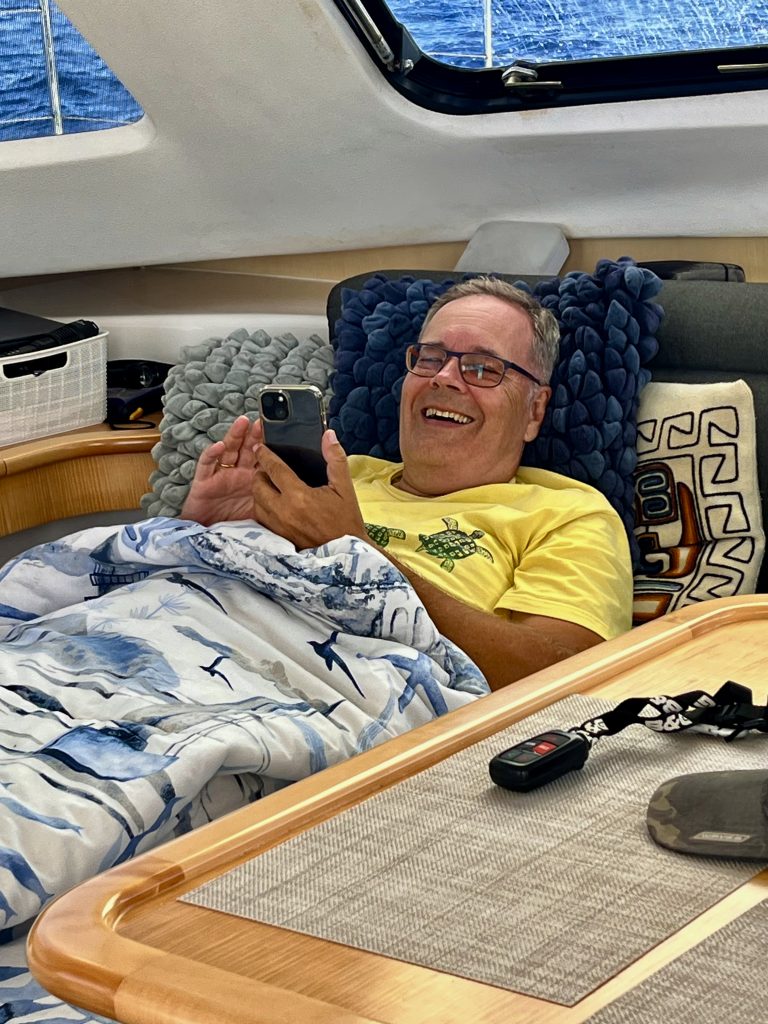 Gerade stellt Klaus fest, unser Track geht nicht mehr. Oh je, die Batterie vom Iridium Go ist wieder zu heiß geworden und aufgequollen. Heiße Scheiße!!! Das passiert vermutlich immer dann, wenn unsere Motoren lange laufen, und die Lichtmaschinen ständig Strom erzeugen und es in unser Netz drücken. Das Iridium Go, mit dem auch das Satellitentelefon betrieben wird, hat da leider immer noch keinen Überhitzungsschutz für seine Batterie. Es ist halt ein veraltetes System, aber ein zweites Sicherheitsstandbein zu Elon Musks Starlink. Klaus hatte ja schon mal ein neues Gerät besorgt, und nun ist es schon wieder im A….! Dann zieht Klaus den Stecker, steckt ihn wieder rein, fährt das Gerät runter und wieder hoch, und siehe da, es läuft wieder. Jippie 🥳. Da ist die Batterie wohl doch noch in der Lage zu arbeiten. Unser Track läuft wieder, alle sind glücklich.