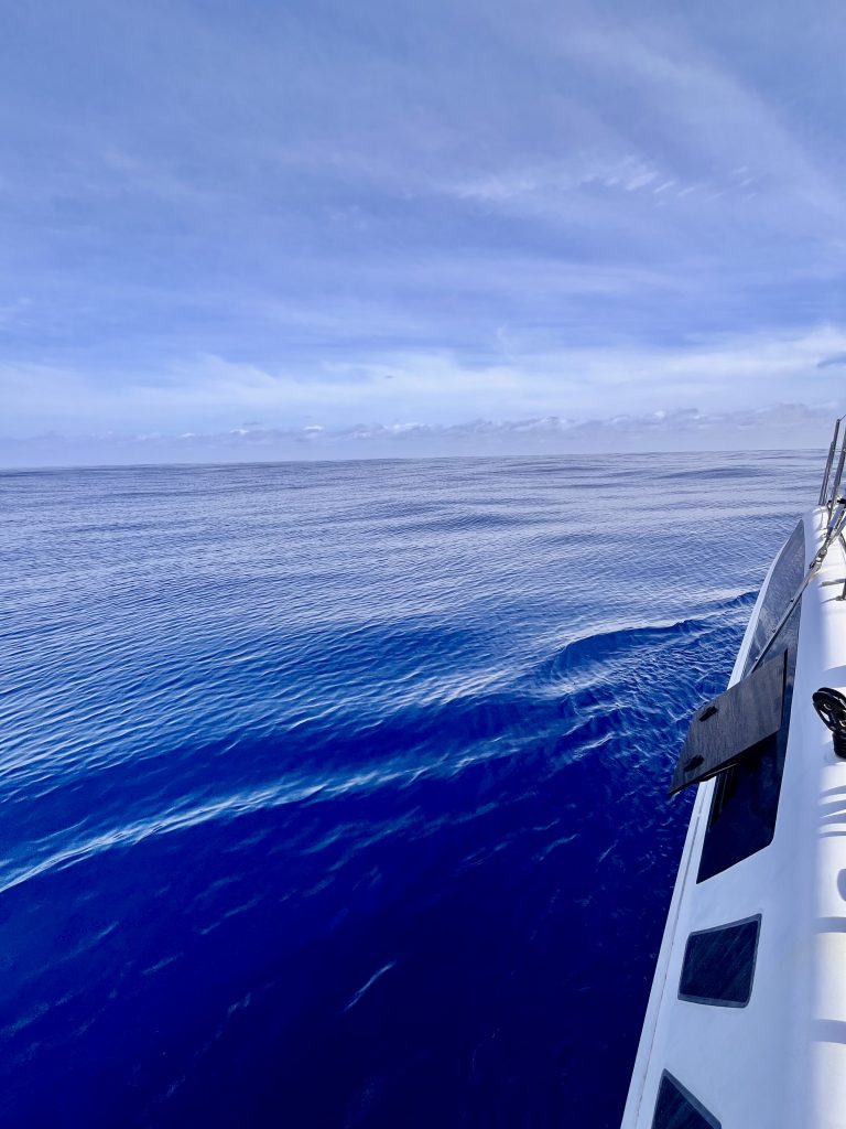 Dienstag, 7. Oktober 2025. Irgendwann dreht sogar der Strom und ist nun mit uns, mit 1,3 Knoten. Bei durchschnittlich 5 Knoten Wind fahren wir sage und schreibe 5,7 Knoten über Grund. Die Wasseroberfläche erinnert mehr und mehr an die Augsburger Puppenkiste. Sie wird glatter, folienähnlicher und hebt und senkt sich gemütlich mit dem Schwell. Ich hatte diesen Vergleich schon einmal im Atlantik gemacht, da war die Wasseroberfläche aber noch viiiel glatter.