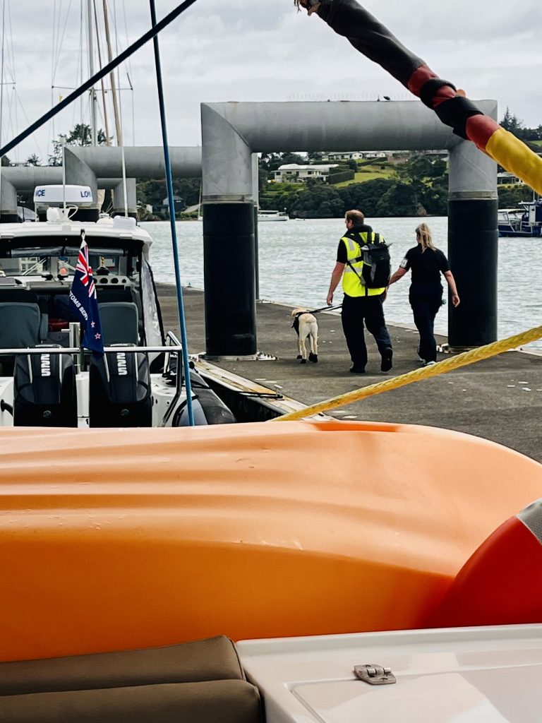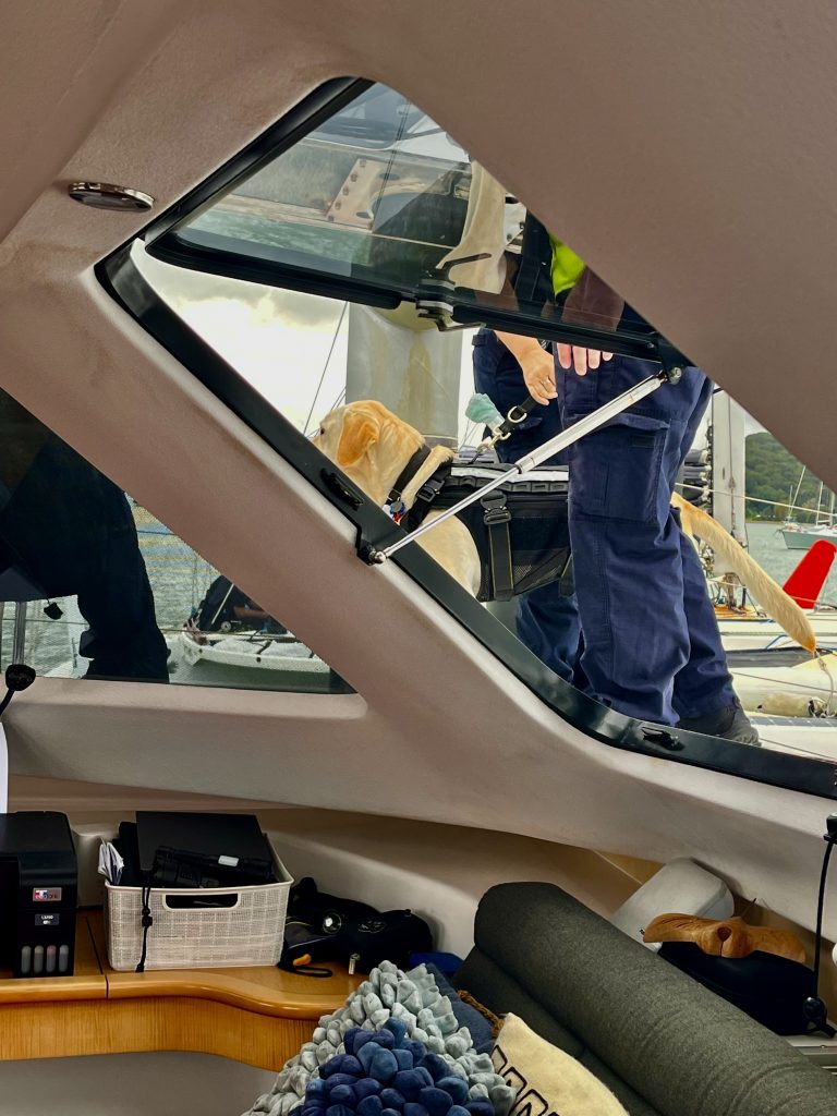 Zack ist der Hund samt Officerin an Bord und soll umgehend mit seiner Schnüffelarbeit beginnen. Bitte nicht dabei stören! Okay ✅. Der zweite, nette Health Officer legt Gummihandschuhe an und beginnt systematisch vom linken Hull bis rüber zum rechten Hull alles genauestens zu untersuchen. Mit Taschenlampe 🔦 im Anschlag, öffnet er alle Schränke, Luken und Bilgen. Der nette Zollbeamte nimmt im Salon Platz und beginnt mit der Papierarbeit und unserer Immigration. Er hat eine Menge Fragen, die wir aber alle beantworten können. So einiges möchte er kontrollieren. Zum Beispiel möchte er auch unsere Buchung der 3-wöchigen Inlandsreise sehen und rät uns noch, ja rechtzeitig die Heimatflüge zu buchen, wenn wir zurück nach Deutschland wollen. Dann setzt sich der zweite Officer zu Klaus und lässt sich den Track zeigen. Warum haben wir in der Nähe Neukaledoniens pausiert, und wie dicht sind wir dieser Insel gekommen? Eine gute Stunde sind alle drei bei und mit uns beschäftigt. Dann verabschieden sie sich freundlichst und wünschen uns eine tolle Zeit in ihrem Land.
