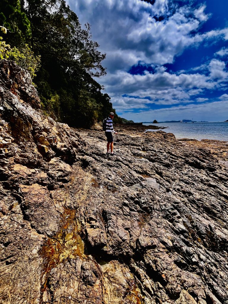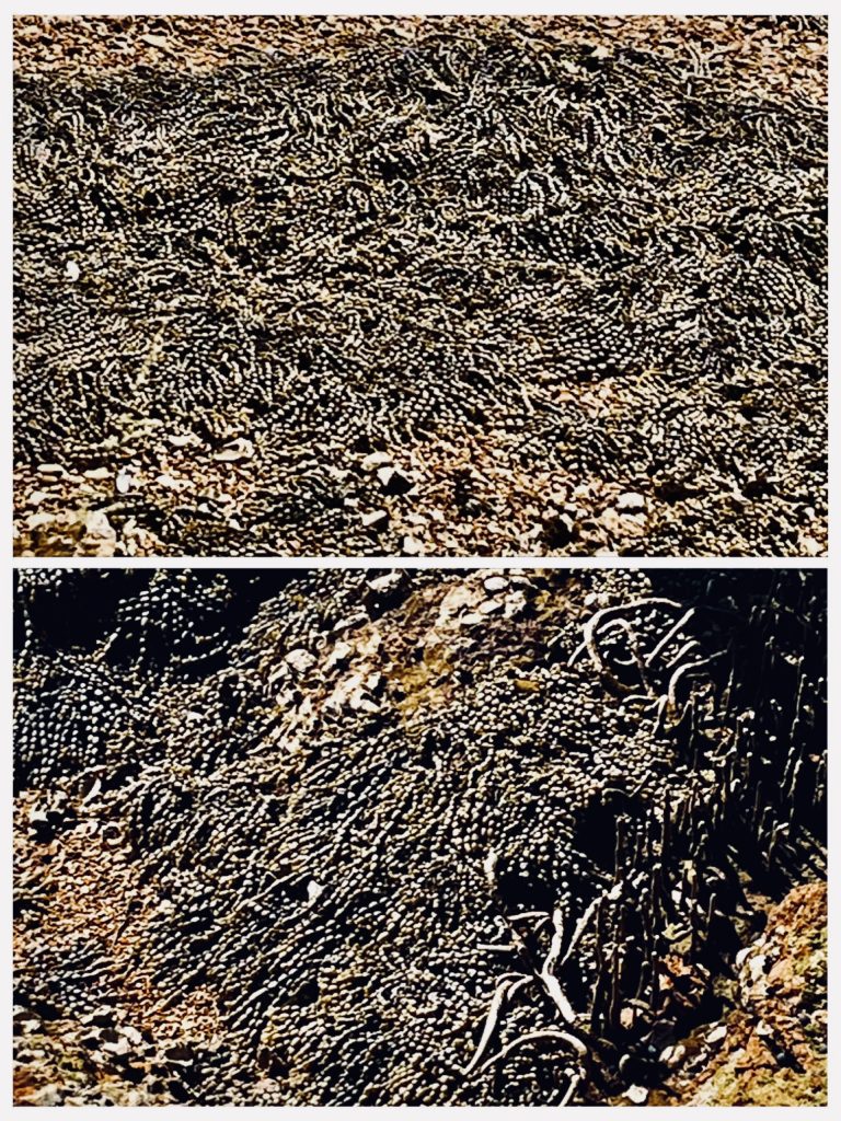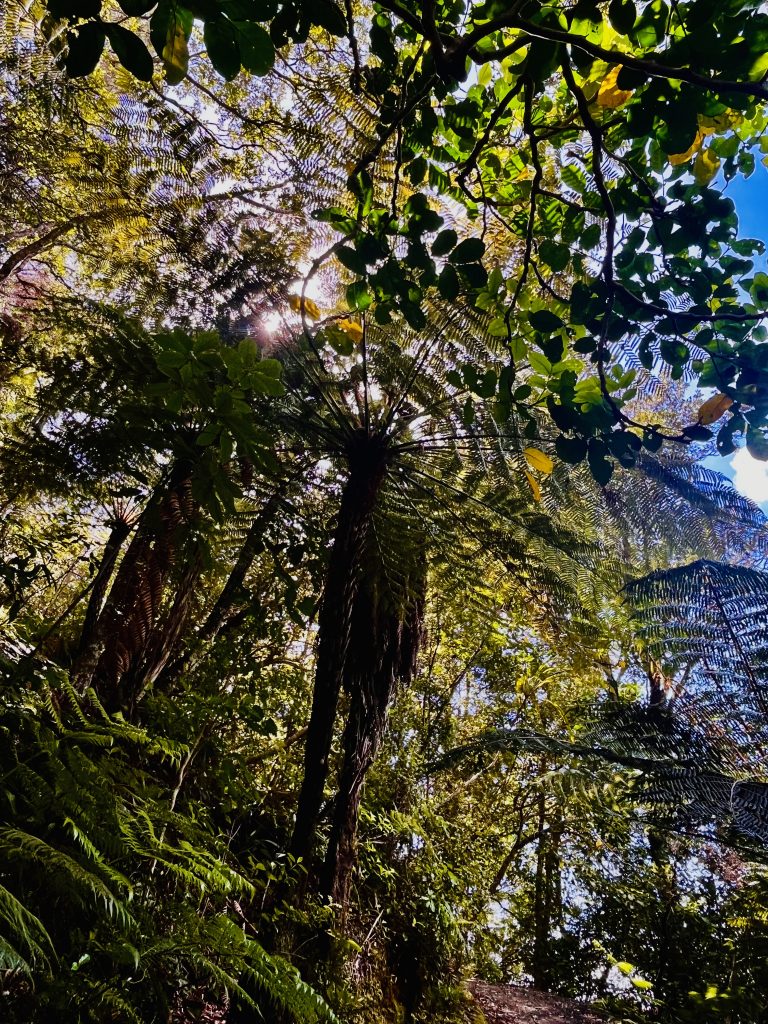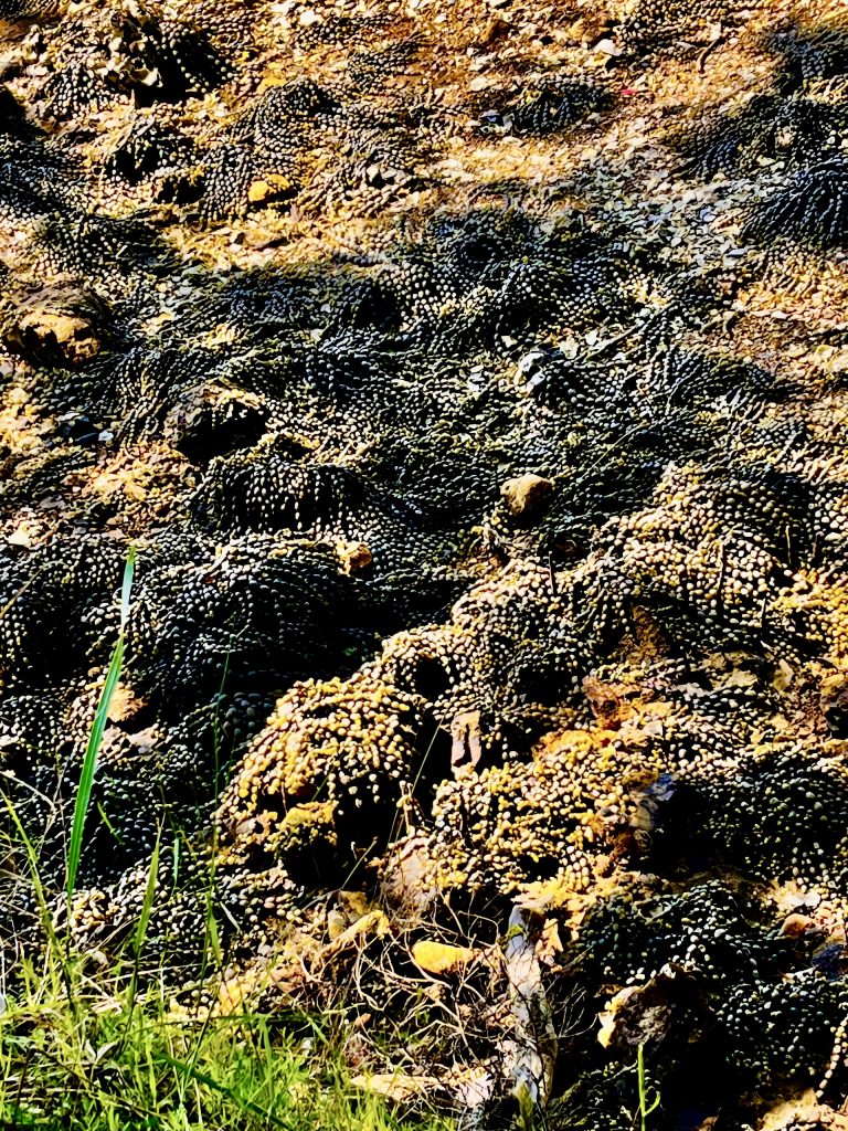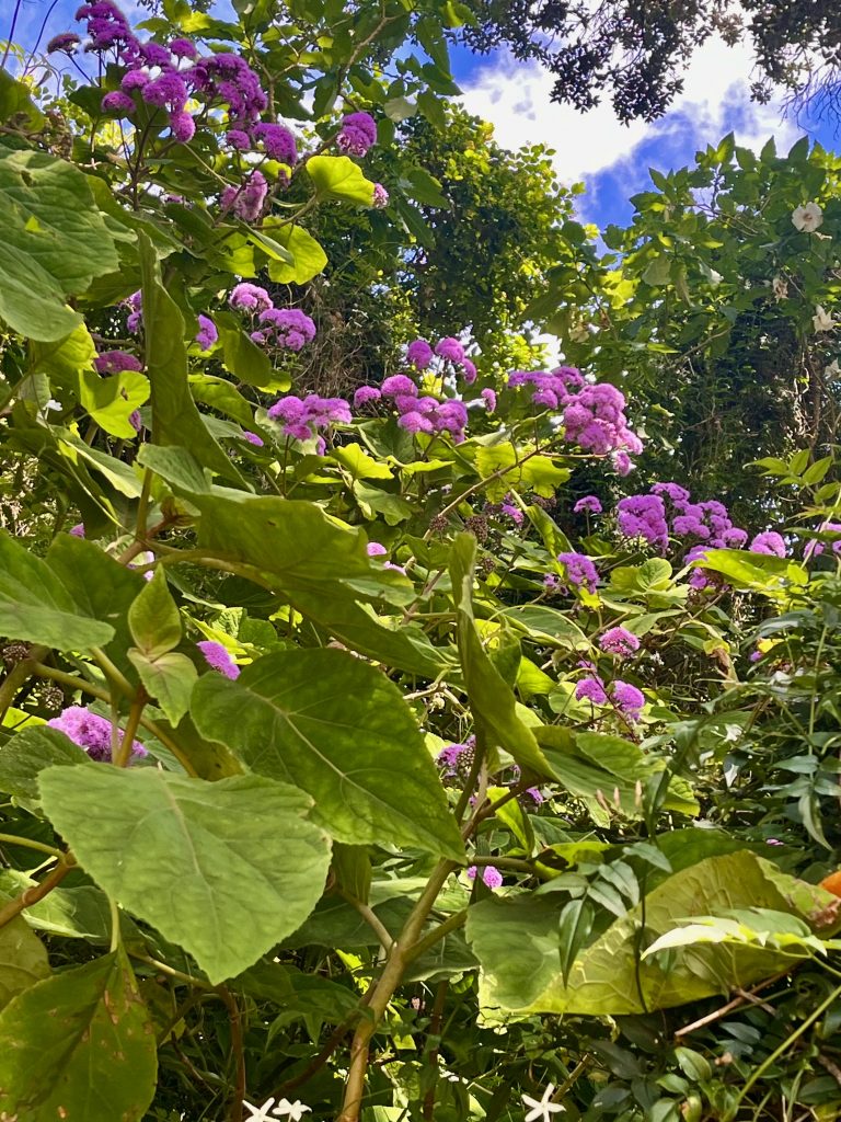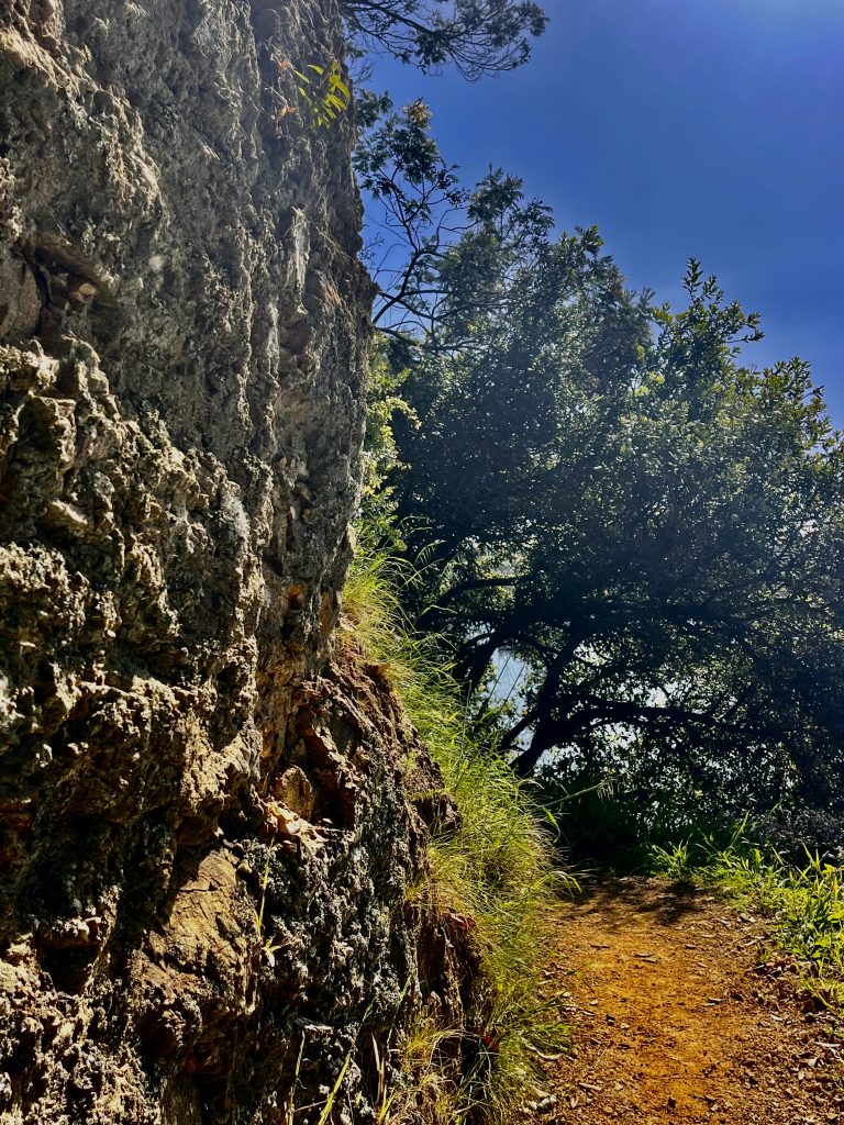 Was sind das denn für Weintrauben am steinigen Strand? Der Trail ist wirklich unglaublich abwechslungsreich. Mal geht’s an der Küste entlang, mal durch Wald, dann an blühender Blumenpracht vorbei, über Mangrovenschlick und Lavagestein und eben am Wasser entlang, vorbei an diesen Wassertrauben. Also Weintrauben sind das keine, wahrscheinlich eher Blasentang-Algen. Sie sind mit Luft gefüllt, um bei Flut im Wasser aufzusteigen. Dann sind sie näher am Licht und können ihre lebenswichtige Photosynthese fortsetzen. Essen könnte man sie glaube ich auch.