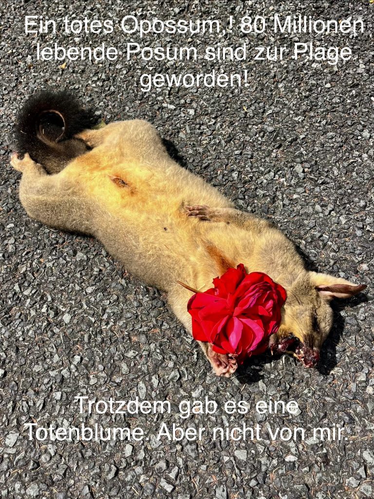 Was machen wir denn jetzt mit dem tollen, freien Tag? Ich muss betonen, es regnet nicht, was äußerst ungewöhnlich für meinen Geburtstag ist! Am 23. Oktober regnet es eigentlich immer, aber nicht heute und nicht in Neuseeland. Vielleicht machen wir einen Fahrradausflug zum Ort an dem alles begann? Jau, das ist ne gute Idee! Wir radeln nach Waitangi, zu dem Ort, der Neuseeland zur Welt gebracht hat, sozusagen, an dem New Zealand erschaffen wurde. Dieser geschichtsträchtigste Ort des ganzen Landes liegt hinter 3 Bergen, aber nicht bei den 7 Zwergen. Und Schneewittchen spielte auch keine tragende Rolle, sondern Europäer und Urbevölkerung, Engländer und Māori, um genau zu sein. Doch die besagten 3 Berge stehen noch zwischen uns. Beim Supermarkt leihen wir uns 2 Mountainbikes, OHNE Elektromotor! E-Bikes hat der gute Mann gar nicht, leider! Dann treten wir in die Pedalen. Oh mein Gott, ich kann nur sagen, es ist schweißtreibend und bringt mich in den Bereich der Schnappatmung! 🥵 So manche Steigung packe ich definitiv nicht, steige ab und schiebe. Klaus tut’s mir gleich. Die Abfahrten gehen umso schneller, wobei es mir vor dem Rückweg jetzt schon fürchterlich graut! Das muss dann alles wieder hochgeschoben werden, Prost Mahlzeit‼️Hoffentlich ergeht es uns nicht wie nachfolgendem Opossum!!!