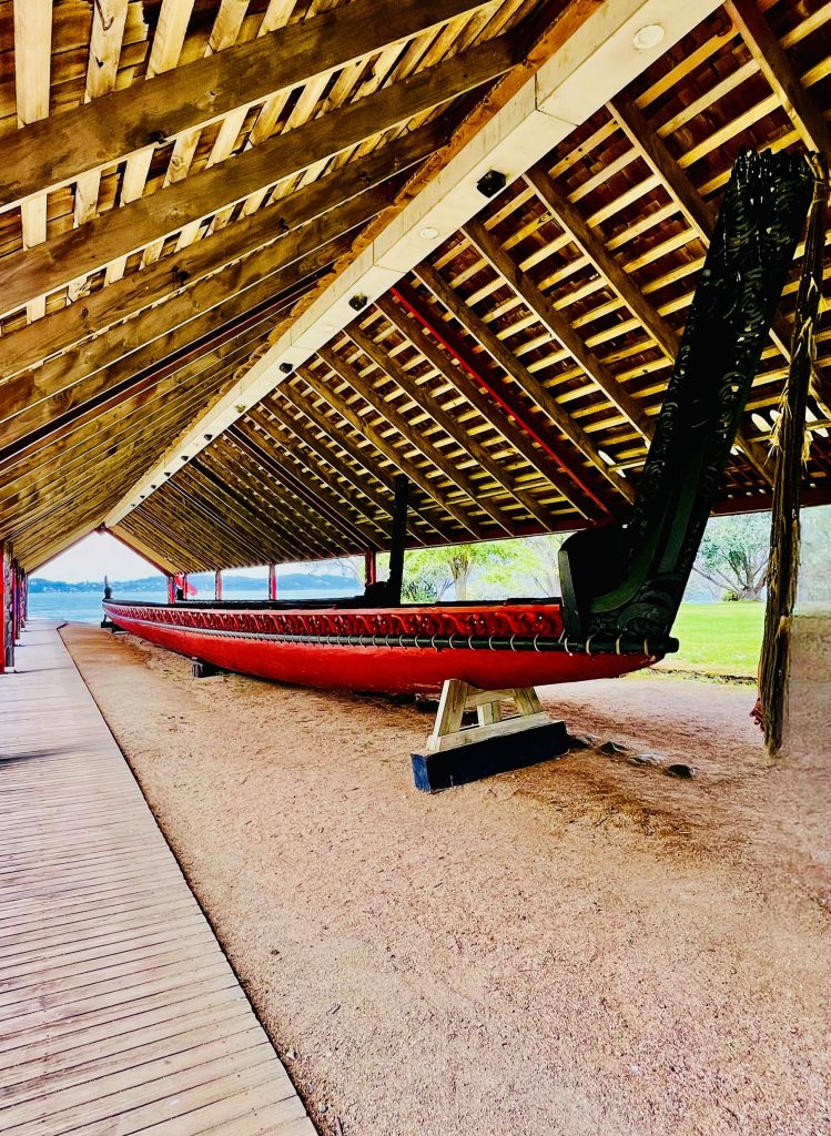 Danach besichtigen wir noch das riesengroße Streitboot, welches von mindestens 72 Māori gerudert werden muss. Immer am 6. Februar jeden Jahres, zum Gründungstag der Nation, wird es zu Wasser gelassen.