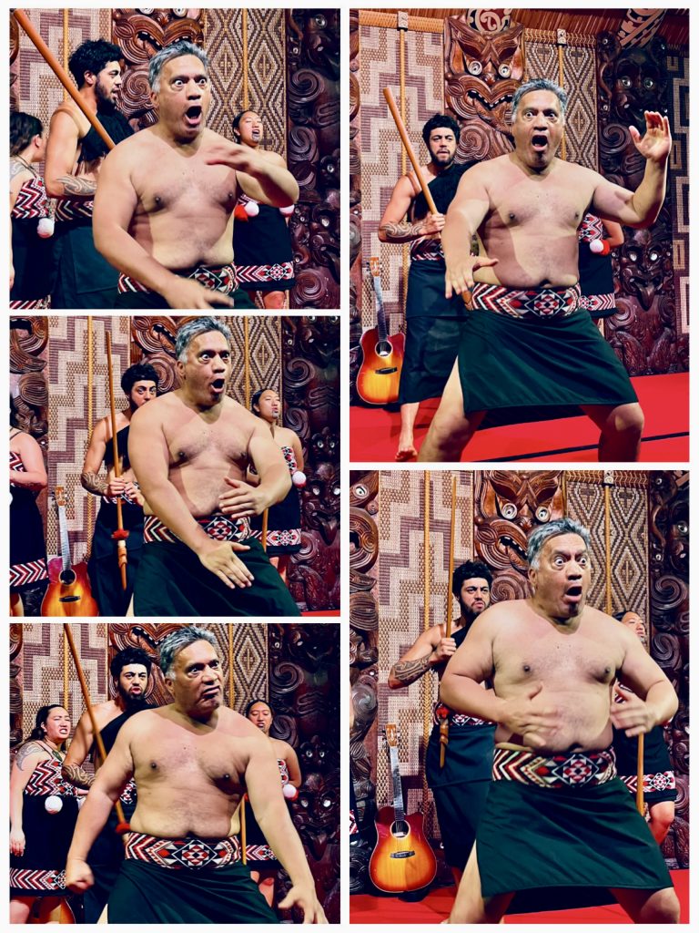 Danach werden uns verschiedene Kampftechniken des Haka, des Kriegstanzes, vorgeführt. Man achte auf die Mimik!
