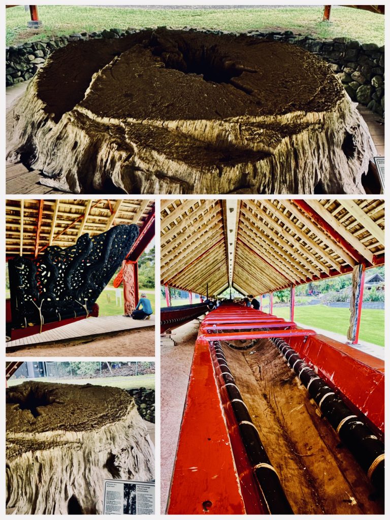 Aus zwei gigantischen Kauri Bäumen ist dieses Kriegs-Kanu geschnitzt. Zuhause haben wir einen Kauri-Tisch stehen. Der wurde allerdings aus einem ausgebuddelten Sumpfkauri geschnitten.