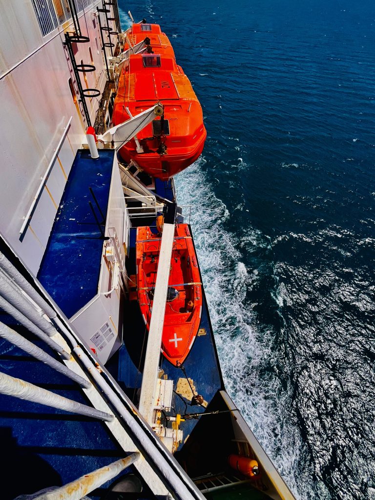 Bisher sitzen wir todesmutig draußen. Der Wind ist eisig und heftig. Die strahlende Sonne wärmt kaum gegen an. Schon bilden sich Schaumkrönchen, was einer Windstärke von 4 entspricht. Wir hauen in den Sack und gehen rein.