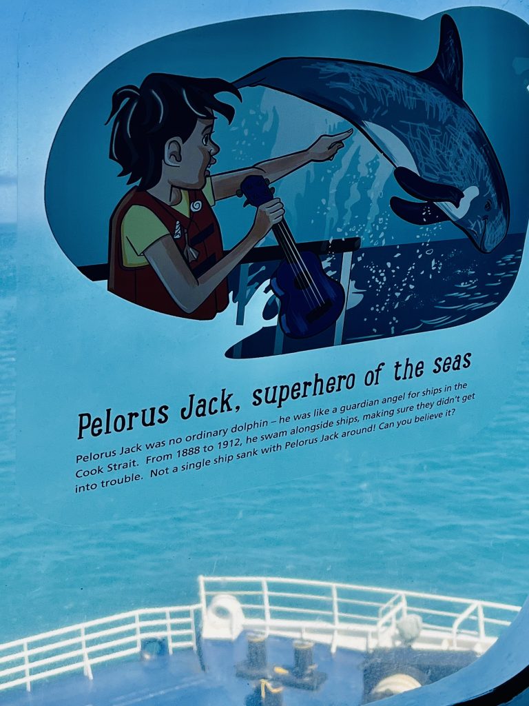 An der Scheibe klebt dieser Sticker mit einer wirklich netten Geschichte. Zwischen 1888 und 1912 geleitete Pelorus Jack, ein Delphin der Region, Schiffe in der schwierigen Cook Straße sicher durch alle Untiefen und Gefahren. Während dieser Zeit sank kein einziges Schiff, unglaublich! Eines Tages schoss ein betrunkener Seemann auf Pelorus Jack und verletzte ihn, zum Glück nicht lebensbedrohlich. Der Schütze kam gerade noch mit seinem Leben davon, wollten ihn seine Kollegen doch vor Wut lynchen. Doch das Tier blieb nun einige Zeit verschwunden, setzte seine Lotsenarbeit jedoch später wieder fort, mit Ausnahme des Schiffes, von dem die verletzenden Schüsse kamen. Unglaubliche Geschichte, was?! Das verschmähte Schiff lief dann auch tatsächlich später auf Grund und sank. Seit dieser Zeit wird der Delphin bis heute verehrt und in Erinnerung behalten. Und viele Schiffe ziert sein Konterfei. 🐬