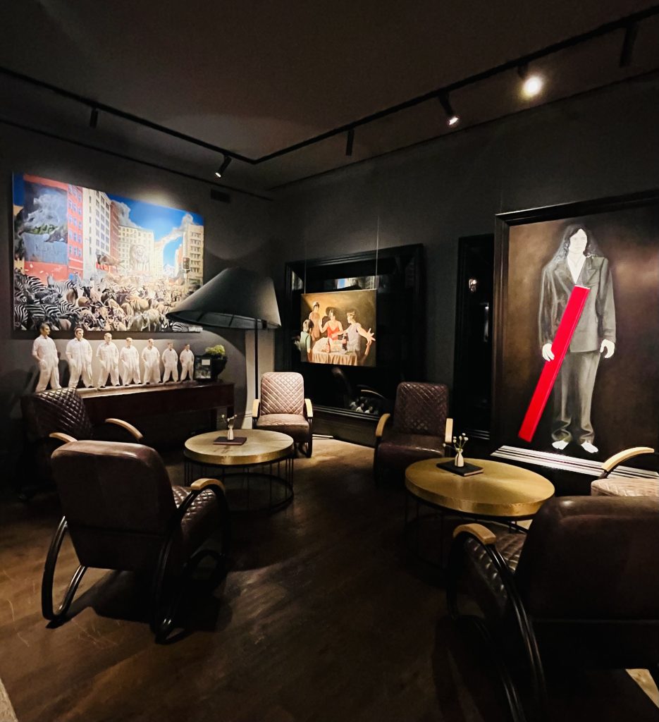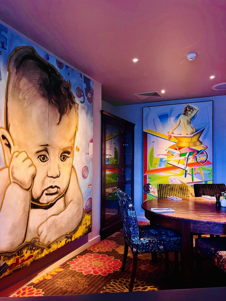 Wie eine dunkle Höhle verschluckt uns dieses Haus. Doch große, leuchtende Bilder ziehen die Blicke sofort auf sich. Ich fotografiere nur einen minimalen Ausschnitt dieser Kunstsammlung.
