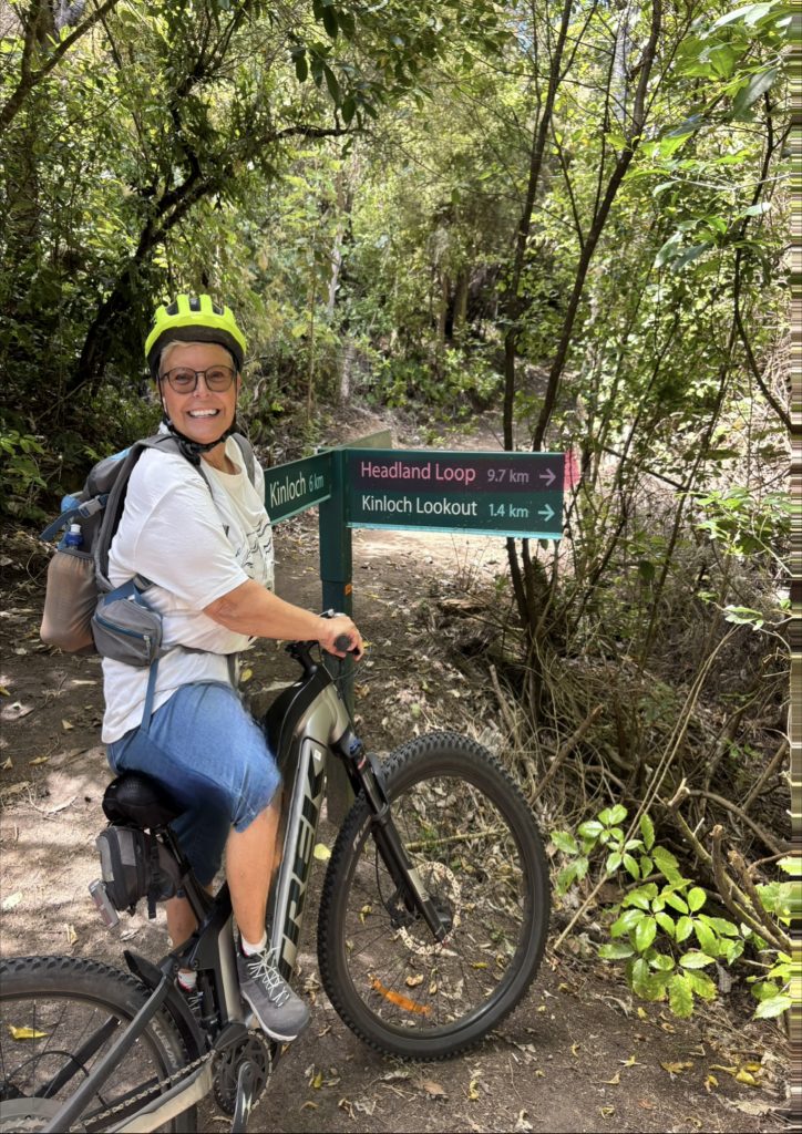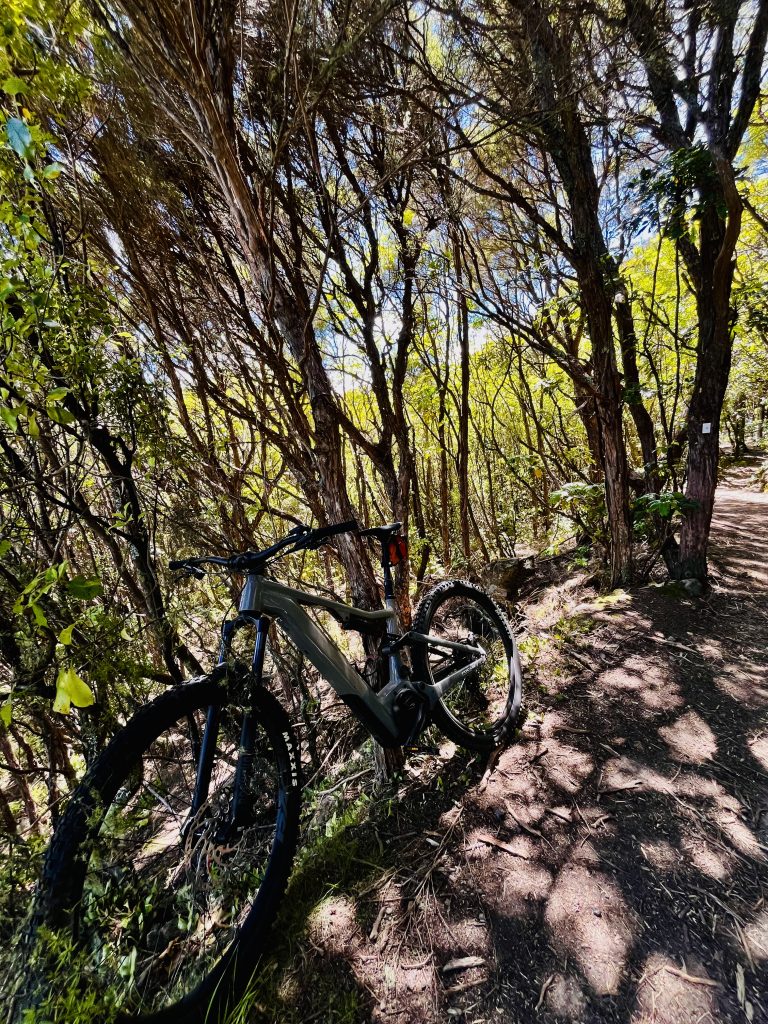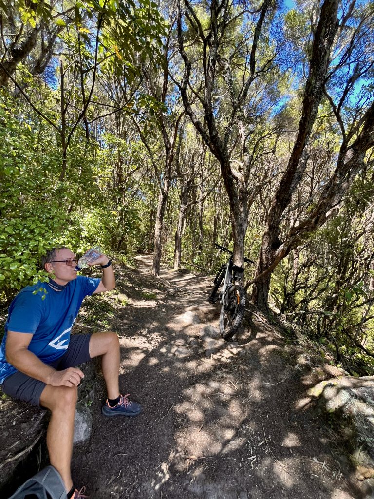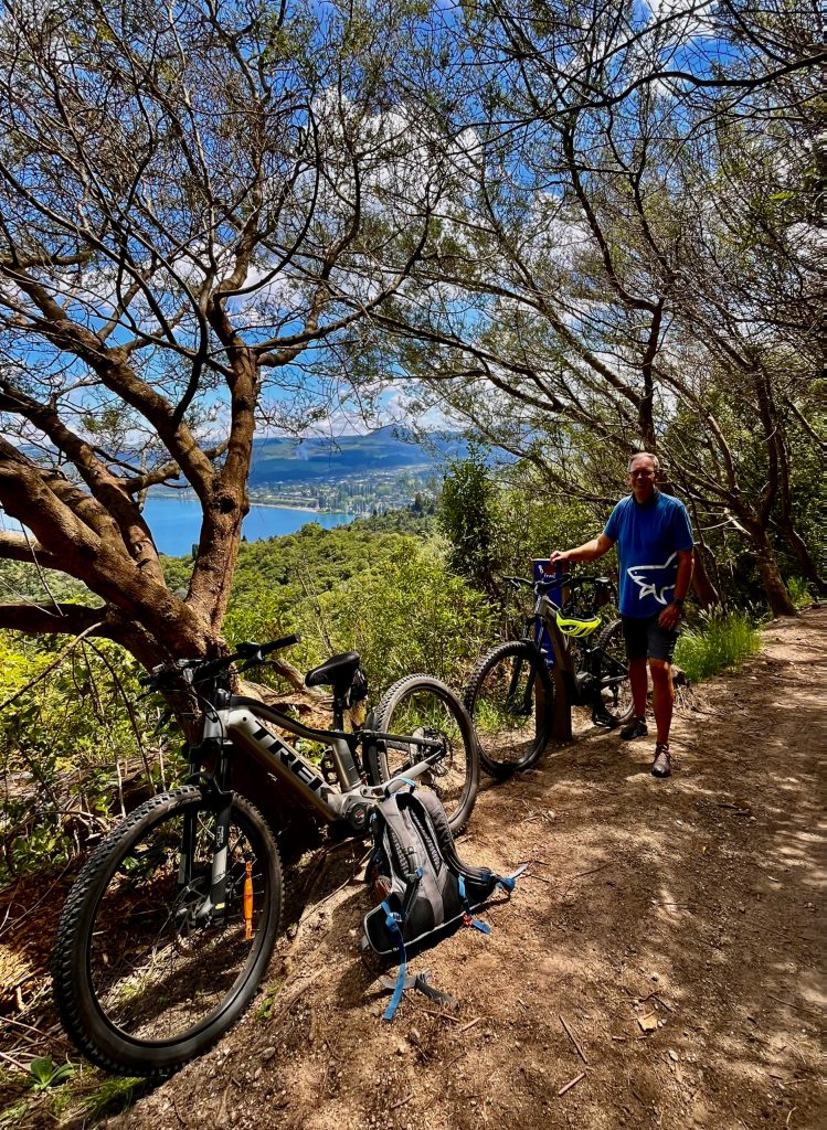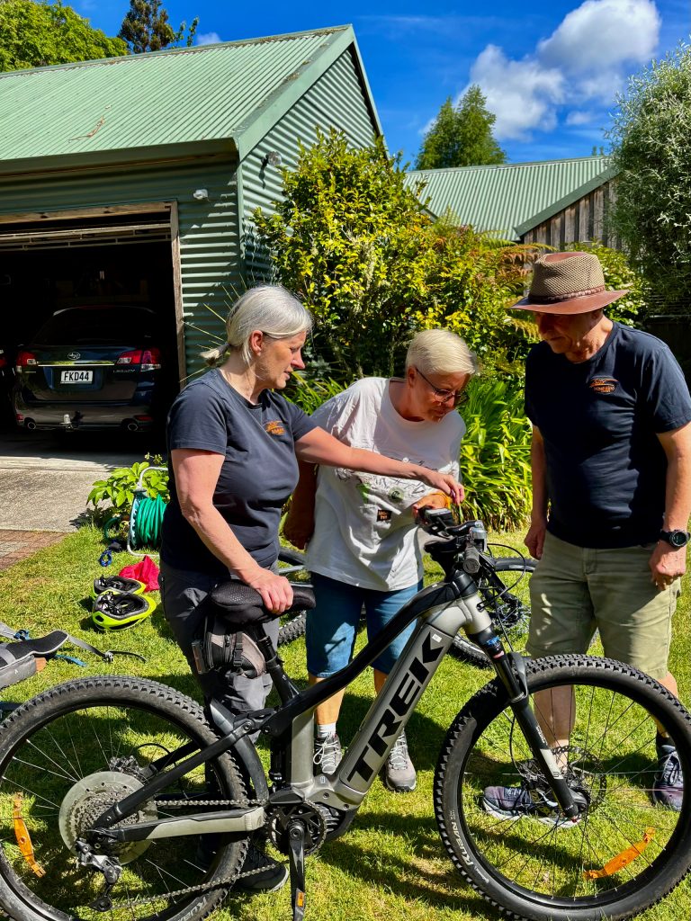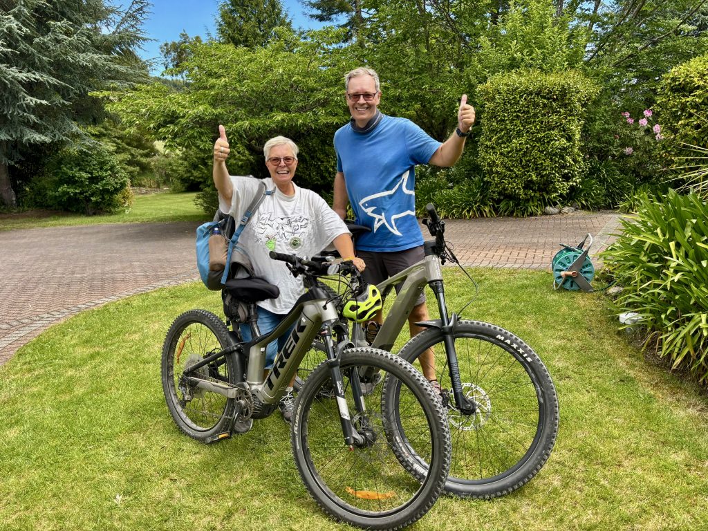 Nun wird’s jedoch ernst. Garth erklärt uns die heutige Tour mit den hauseigenen Elektro-Mountainbikes. Was heißt hier hauseigene? Es sind ihre persönlichen Bikes und sie sind ziemlich neu. Nicht zu viel Strom sollen wir verbrauchen, nicht zu schnell fahren, bei Gefahrenstellen eher absteigen und schieben und die Räder nicht gegen Felsen lehnen. Wir sollen Zettel ausfüllen, unsere Gesundheit und Fitness bestätigen, und angeben, wie oft wir schon E-Mountainbikes gefahren sind. Ja oft, gell?! 🫣 Dann muss auch noch unsere Kreditkarte hinterlegt werden, sollte den Rädern etwas zustoßen. Den Rädern wohlgemerkt, nicht uns. 😅 Jetzt werden noch diverse Horrorgeschichten von Unfällen anderer Biker erzählt und der zu fahrende Track bis in die kleinsten Einzelheiten genauestens beschrieben und erklärt. Mann Garth, jetzt reicht’s aber! Wir wollen doch bloß Fahrrad fahren. Nun gut. Jetzt werden wir in die Technik der Räder eingewiesen…