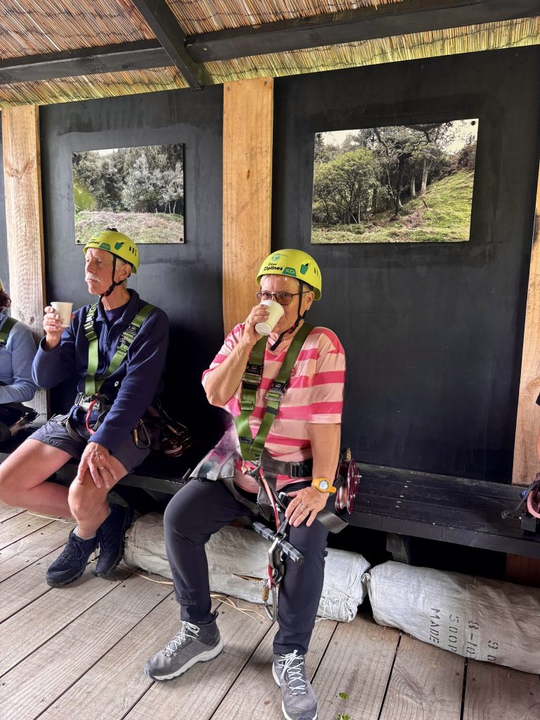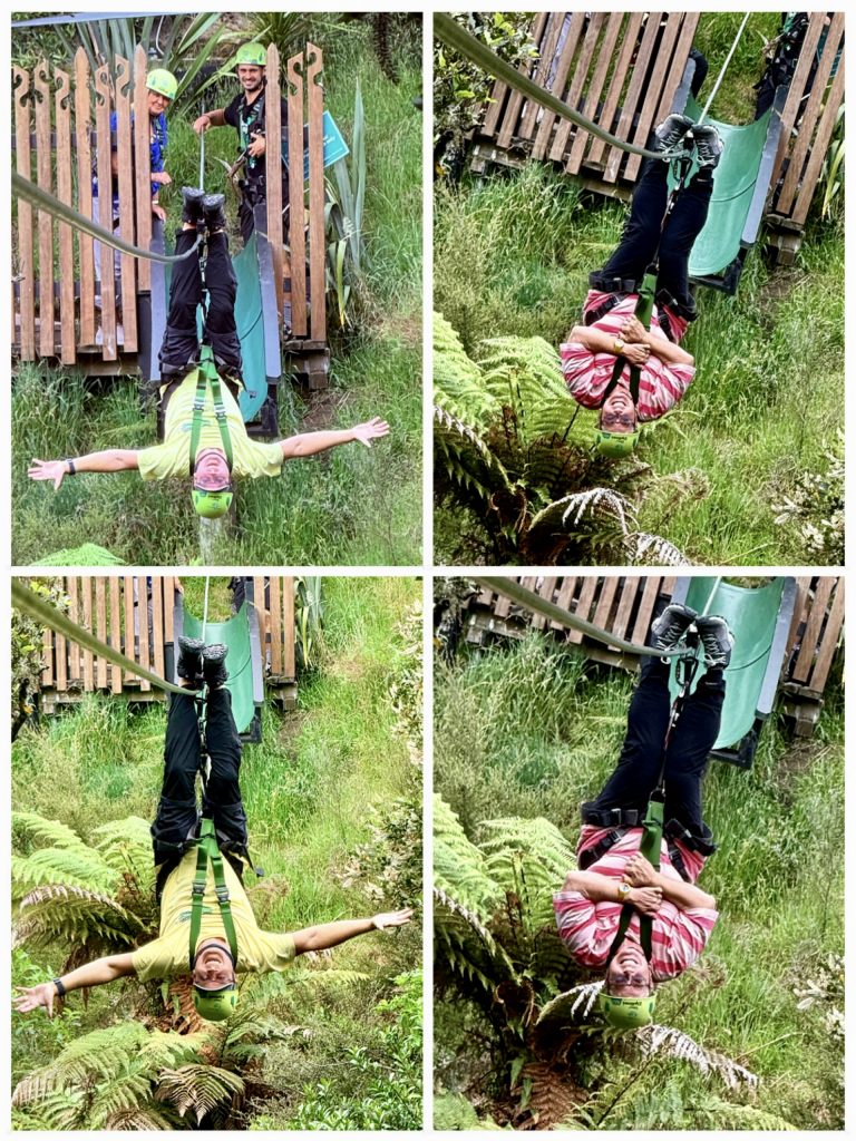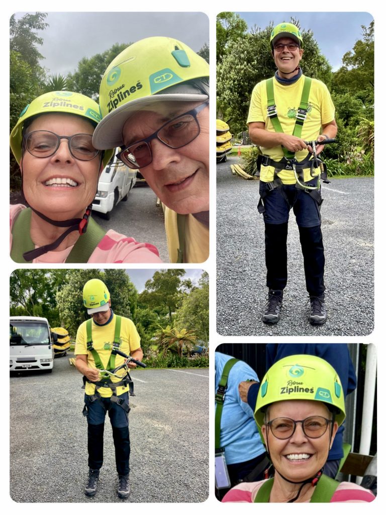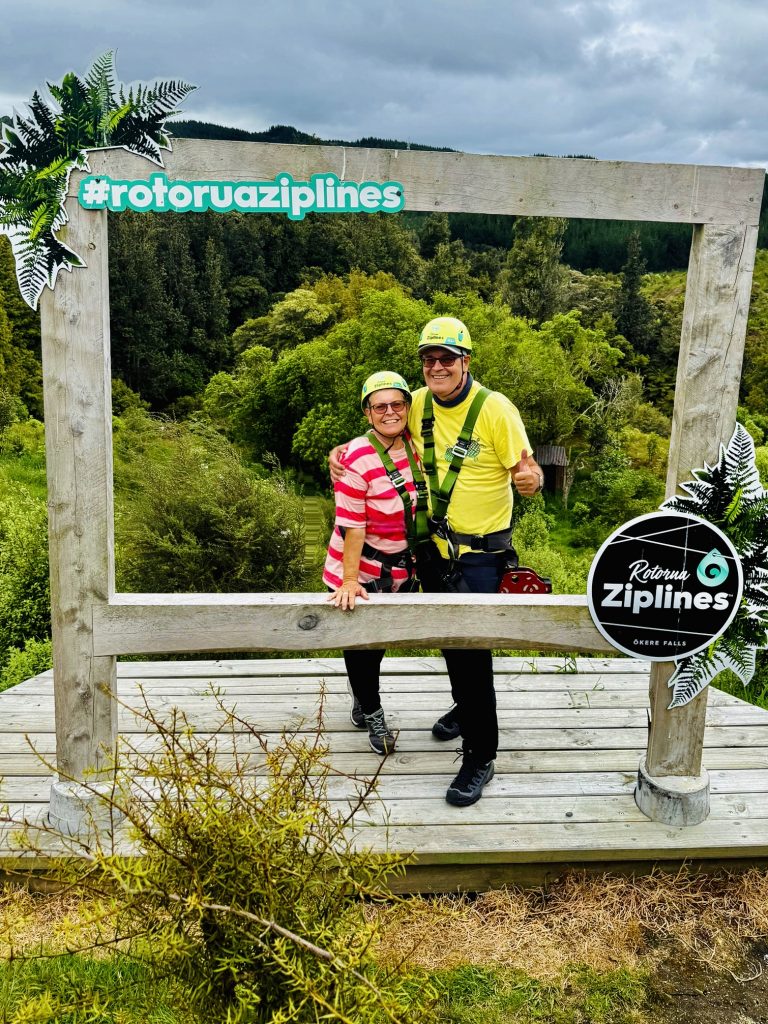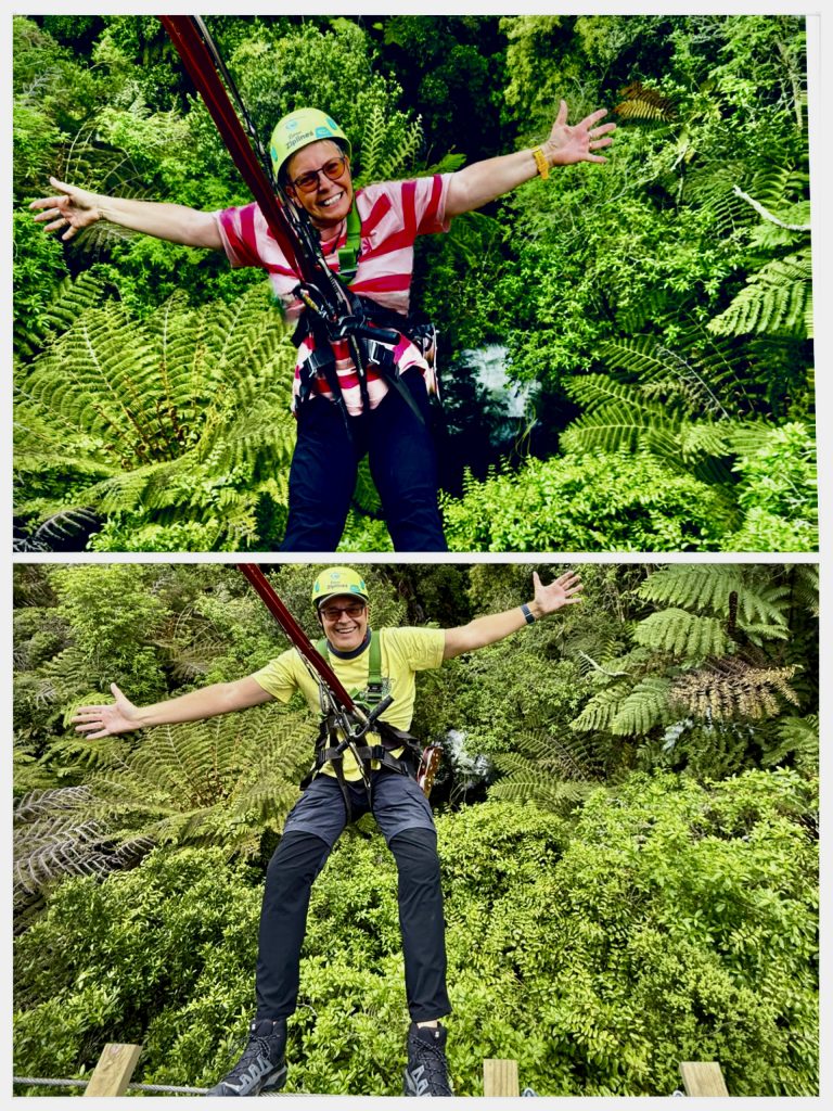 Eine sehr nette Ärztin empfängt uns. Sie schaut in Klaus‘ Ohren und seufzt. Das eine Ohr hat ein Loch im Trommelfell, das andere ist entzündet, zugematscht mit einer weißen Schleimschicht und etwas Blut und hat ebenfalls ein dahinterliegendes Loch. Denn wenn Klaus Luft durchs Ohr drückt, blubbert der Schleim. Wow, die Ärztin lässt mich mal reinschauen. Das sieht ja sehr interessant aus. 🧐 Sie nimmt einen Abstrich, verschreibt wieder antibiotische Tropfen, für Ohren mit Loch, und meldet sich, falls der Abstrich ein anderes Medikament erfordern würde. Noch im Auto tropfe ich ihm zwei Tröpfchen ins rechte Ohr. Es sind übrigens die gleichen Tropfen, die Klaus zuvor schon getropft hatte. Hmm… 🤔. Nun machen wir uns auf den Weg zum nächsten Event. Rotorua Ziplines ist das Ziel, 100 Kilometer entfernt. „Episch“ sollen wir dort durch die Lüfte fliegen.