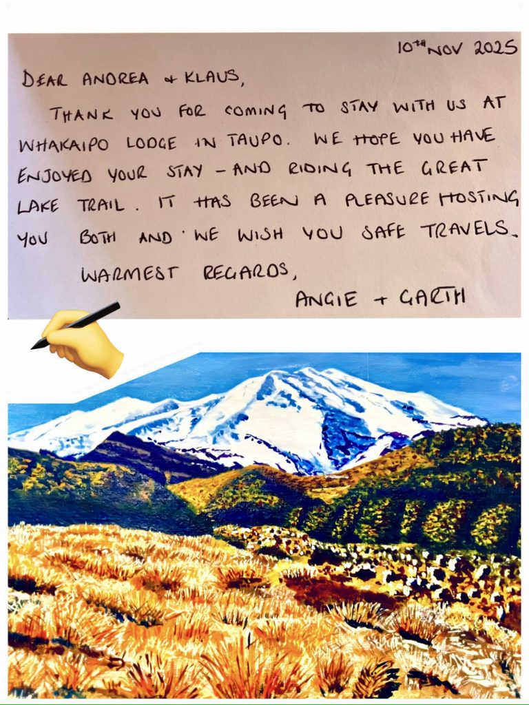 Nach einem zweiten köstlichen Frühstück, Garth hat derweil beim Arzt angerufen und für 10:00 Uhr einen Termin gemacht, müssen wir uns von unseren tollen Gastgebern verabschieden. Leider. 😔 Zum Andenken bekommen wir noch eine Karte, mit einem von Garth gemalten Motiv und lieben Worten.