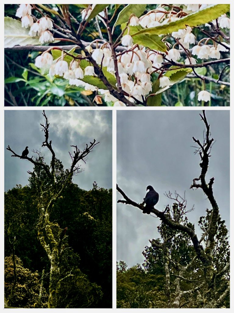 Wir lernen erstmal so einiges. Was blüht? Was wächst? Was gedeiht? Ach nee, ne dicke fette Maorifruchttaube leistet uns Gesellschaft. Überhaupt lebten und leben hier viele Māori. Das meiste Land ist tatsächlich noch in ihrem Besitz, und explizit hier haben sie ein Aufforstungsprogramm aufgelegt. Von jedem Eintrittsgeld wird ein kleiner Teil für einen neu zu pflanzenden Baum eingesetzt. Das gefällt mir. Früher, noch vor der Kolonialisierung, lebten hier verschiedene, rivalisierende Stämme, die sich oftmals blutig bekämpften und manchmal auch gegenseitig auffraßen. Wenn eine Gruppe ins verfeindete Land der anderen musste und sich die Gruppe nicht verlieren wollte, knickten sie die Blätter des Silberfarns um. Die silbrige Unterseite leuchtete auf und zeigte den genommenen Weg an. Ein wortloser, stiller und unauffälliger Wegweiser. Der Letzte knickt die Spitze wieder zurück und keiner hat’s gesehen. Eigentlich, so meint unser Guide, sollte der Silberfarn das Landeswappen zieren. Er ist sooo viel häufiger im Land zu finden, als der Kiwi, und er hat für viele eine wichtige Bedeutung. Jepp, jetzt wo er es sagt, fällt mir ein, viele Unternehmer haben den Farn in ihrem Firmenwappen. 🌿