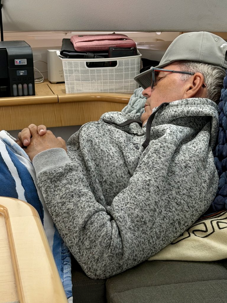 und schaukeln gemütlich voran. Dann gibt es etwas zu tun. Das Screecher muss wieder aufgebaut werden, denn der Wind ist mittlerweile doch etwas zu wenig fürs Jib. Allerhopp. Das Boot ist komplett mit Salz paniert, und Klaus spritzt es notdürftig mit unserem Frischwasser ab. Plötzlich kommt nichts mehr, die Frischwasserpumpe hat den Geist aufgegeben, wieder einmal… 🫤. Gibt es wohl irgendein Gerät an Bord, das mehr Aufmerksamkeit vom Kapitän bekommt als die Frischwasserpumpe??
