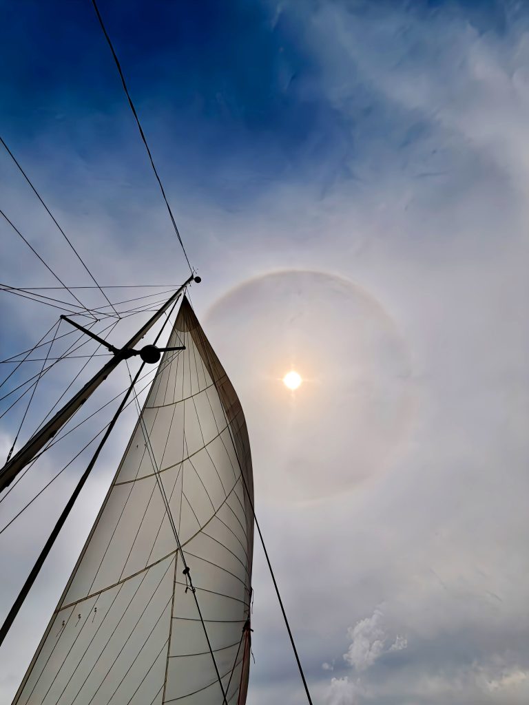So geht es dahin, bis der Strom nach und nach seine Richtung ändert und der Wind wieder übernimmt. Es ist noch Zeit, bei herrlichem Sonnenschein, ein paar aufgetrieselte Nähte und Schubberlöcher im Jib zu reparieren. Wir sitzen beide vorne und geben uns abwechselnd die Nadel in die Hand. 🪡🧵 Auf die Löcher wird Spezialfolie geklebt. Fertig ✅ Eigentlich ist unser Jib durch, kaputt und dreckig und müsste ausgetauscht werden, so wie unser Groß. Das Tolle ist, wir haben ein nigelnagelneues Jib in unserer großen Luke zu liegen. Ich denke, wir tauschen es demnächst mal aus. 😁