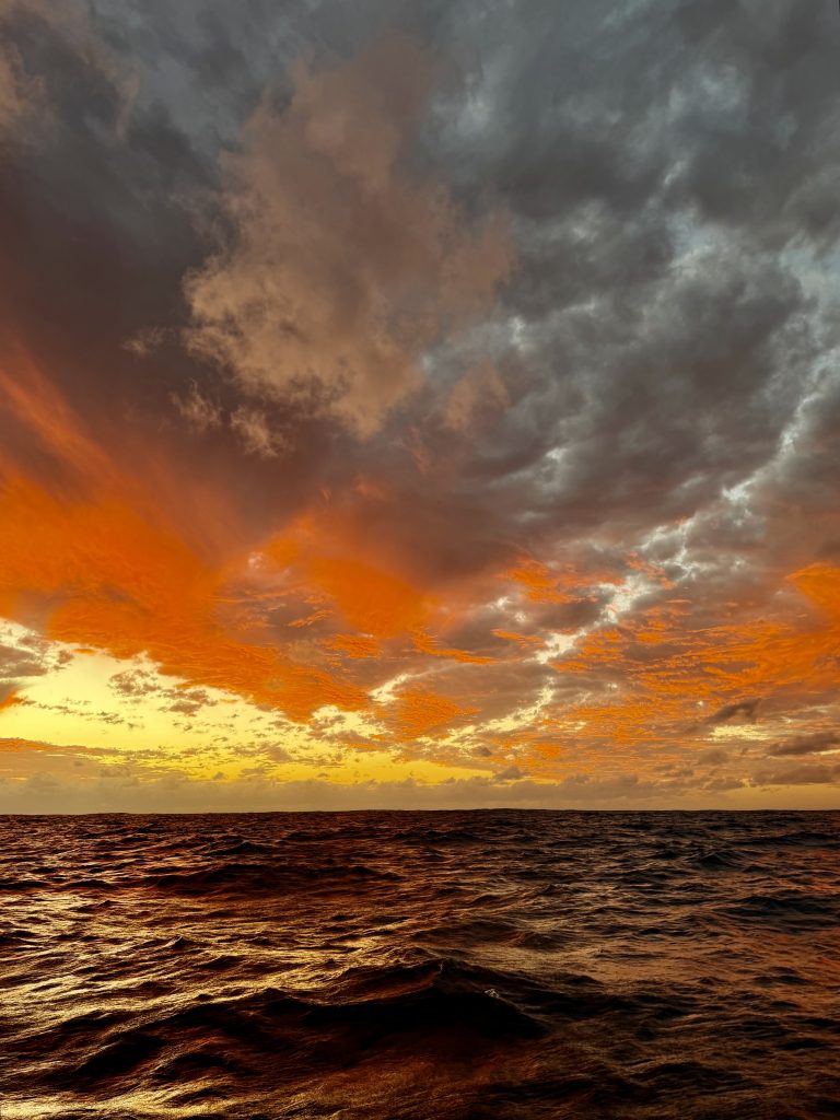 Ich befinde mich in meiner Nachtwache, da gibt es plötzlich einen lauten Knall. 💥 Huch, was war‘n dass?? Reißen etwa erneut die Wanten? Nee, aber ich höre weiteres Gerumpel. Beim Hinaustreten rieche ich es schon, Fischalarm! 🙊 Ein größerer Fliegefisch hat es bis in den Leinenkasten geschafft und zappelt hektisch weiter darin herum und kackt. Ich schnappe ihn mir und werfe ihn wieder zurück ins Wasser. Gut. ✅ Meine Hand stinkt jetzt aber nachhaltig, iiiiiii. Heißt es nicht immer, wenn der Fisch nach Fisch stinkt, ist der Fisch alt?! Komisch. 🤔