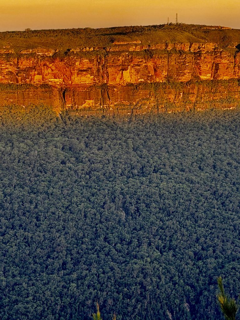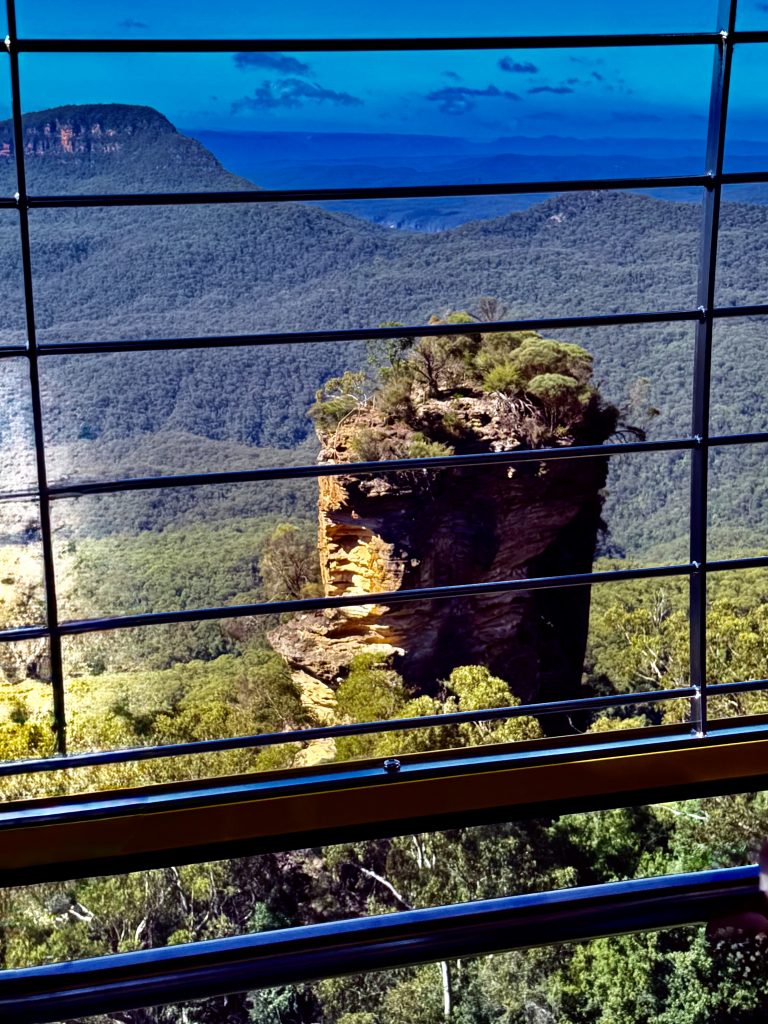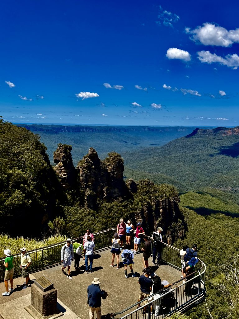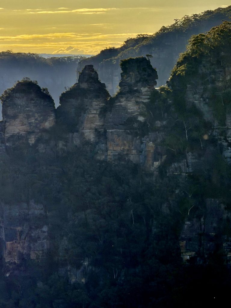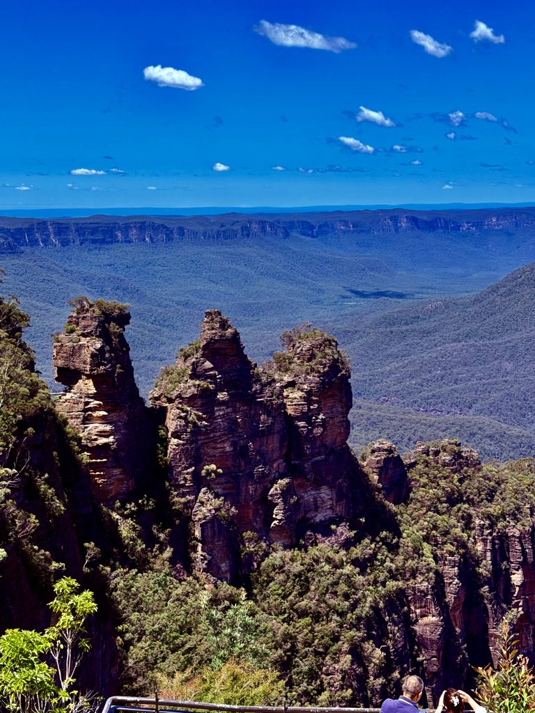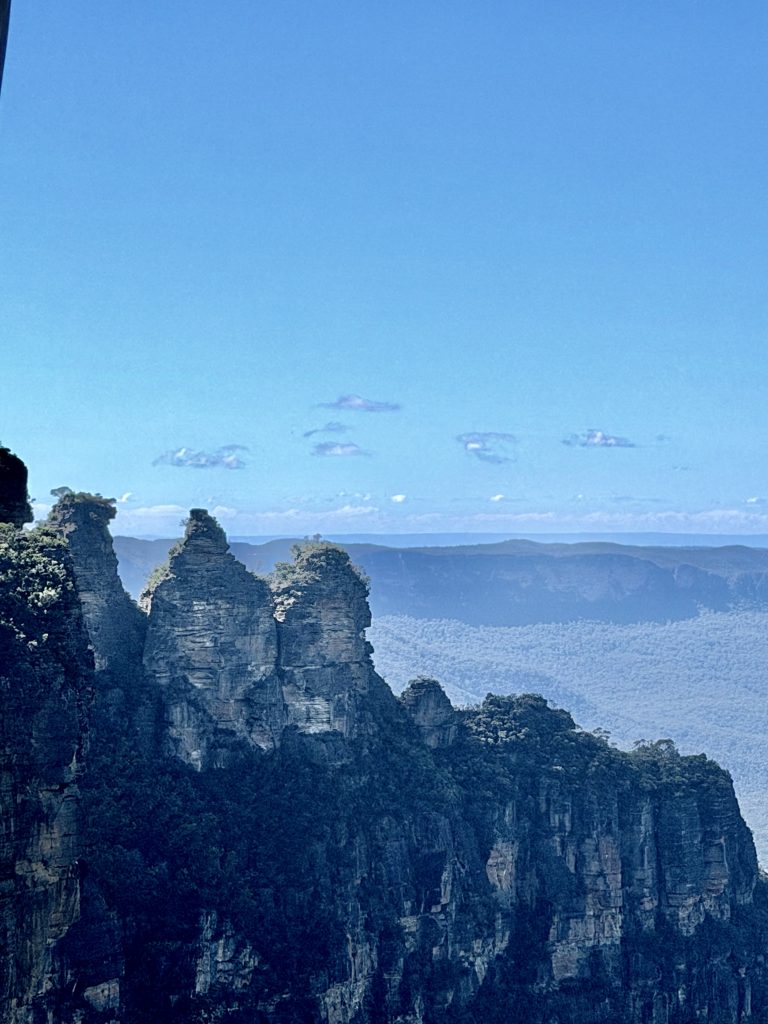 Jetzt wieder zurück zum riesigen Eukalyptuswald, der der eigentliche Grund für die Namensgebung “Blue Mountains” ist. Die ätherischen Ausdünstungen dieser Bäume erzeugen nämlich einen bläulichen Dunst, und dieser Dunst erweckt dann den Eindruck blauer Berge. Das aber insbesondere bei Sonnenauf- und Sonnenuntergang. Also jetzt nicht wirklich. Schade! Na, dann schauen wir doch mal nach den drei Schwestern, eine Bergformation aus drei nebeneinander stehender Steinsäulen.