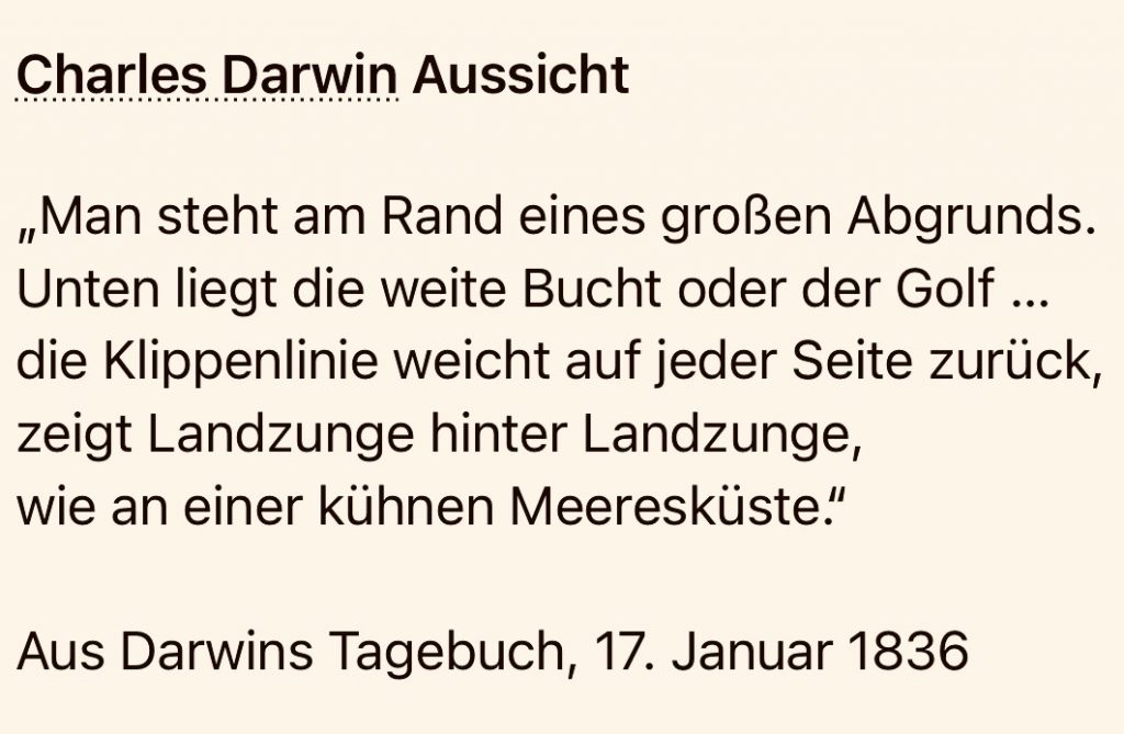 Ach schau einer an, auch Darwin hat sich hier herumgetrieben. Der war doch wirklich fast überall auf dieser Welt. Und was hat er da im Januar 1836 geschrieben?