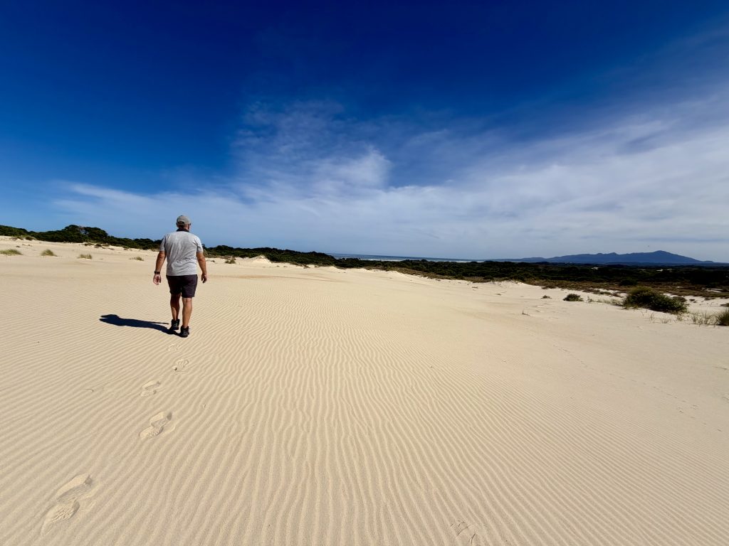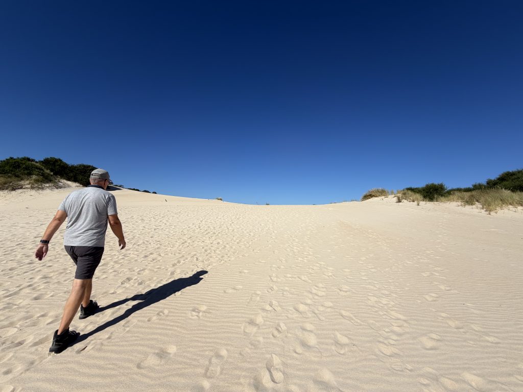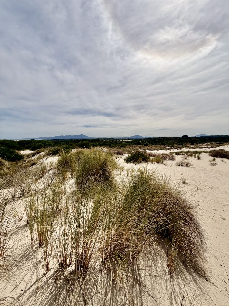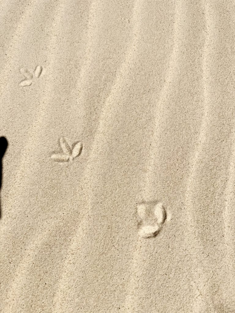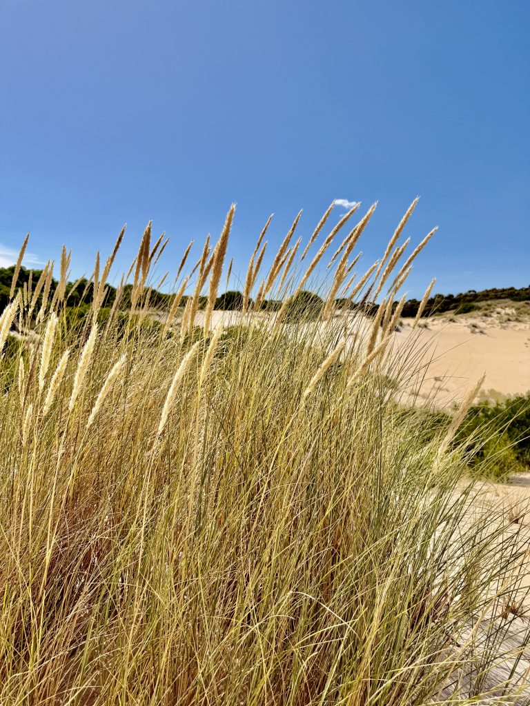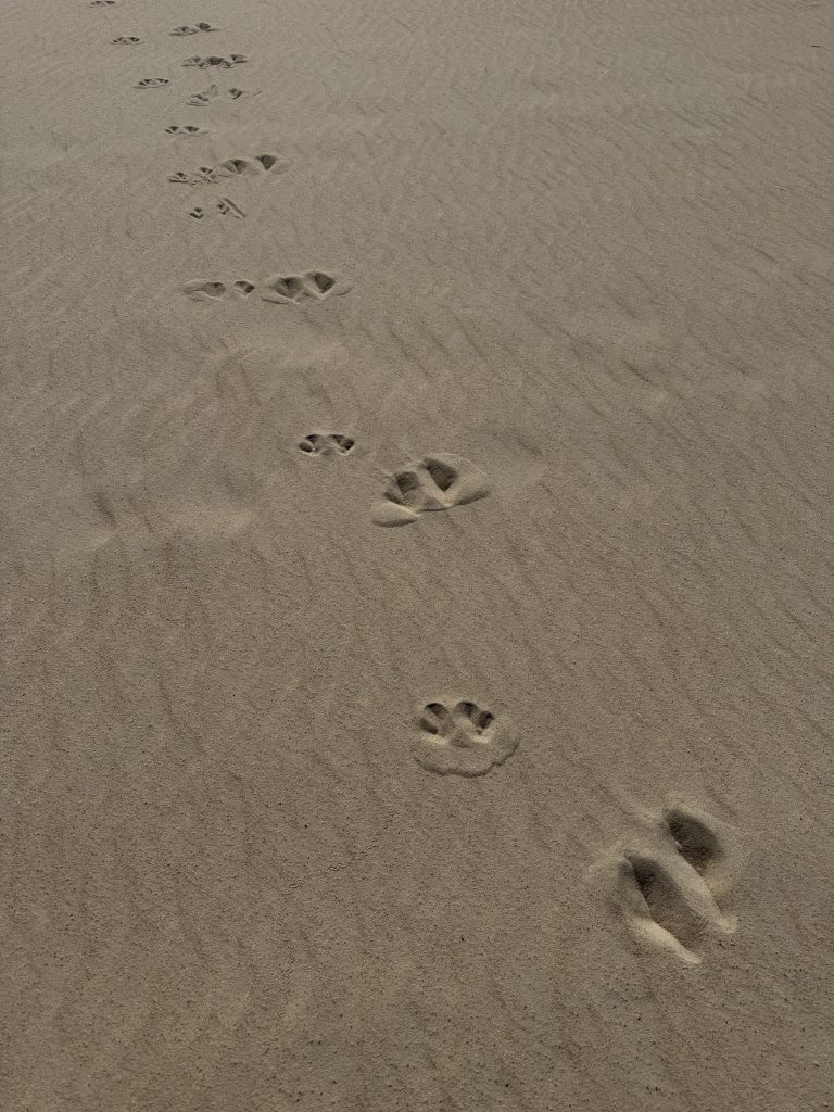Wir wandern Dünen hoch und wieder runter, durch Dünengras hindurch, versinken im lockeren Sand und laufen auf festeren Stellen, dann auch schneller….