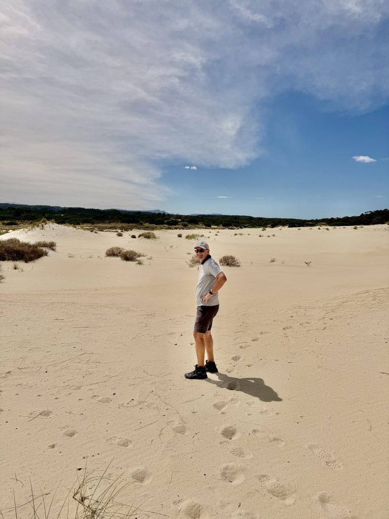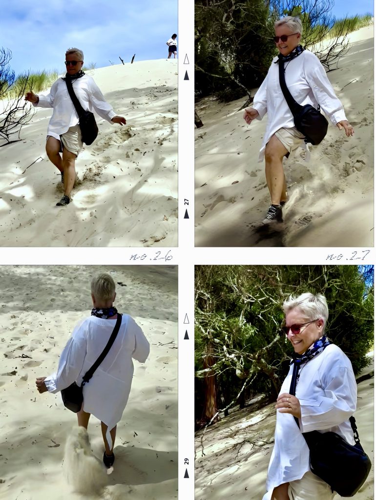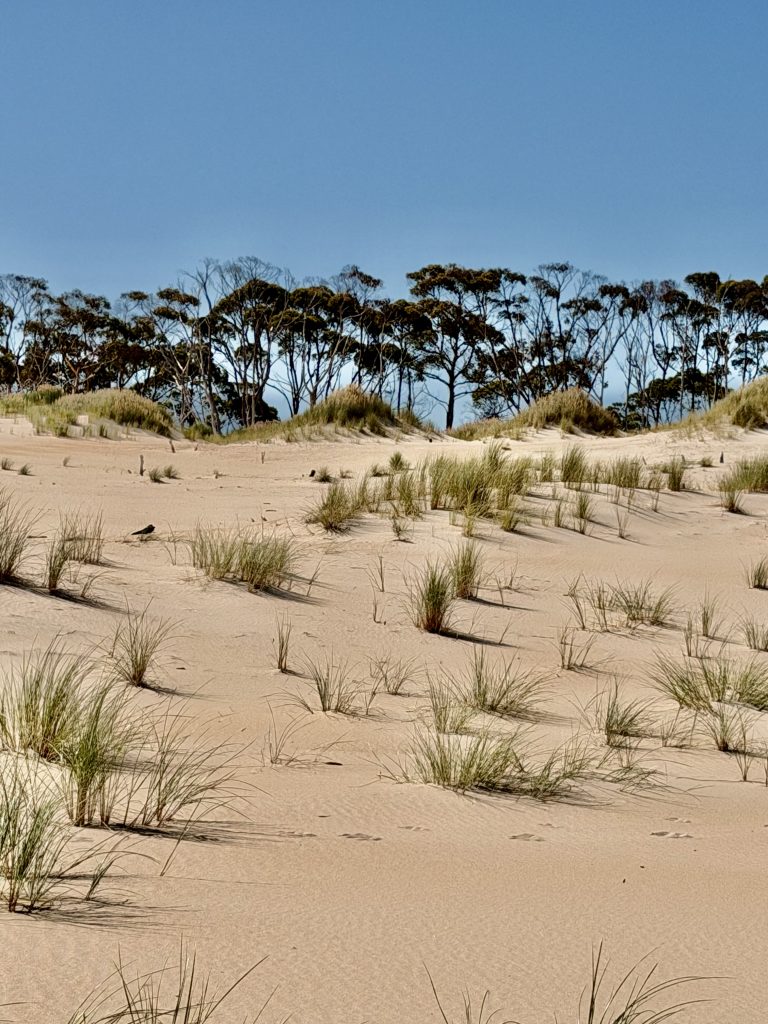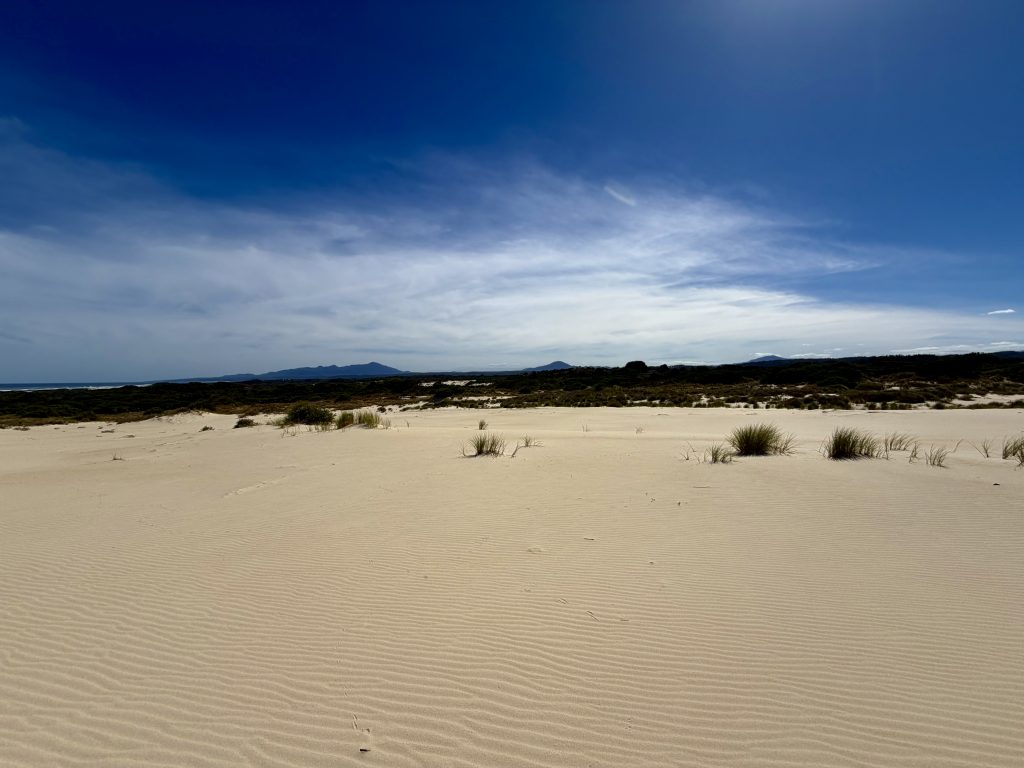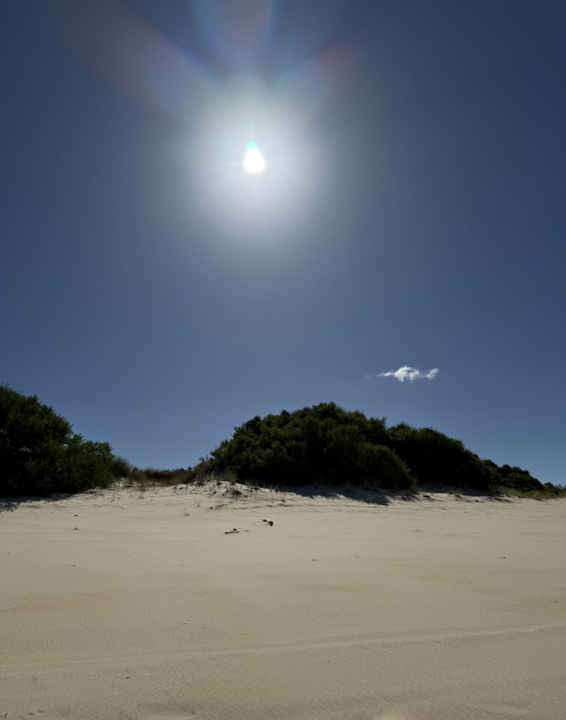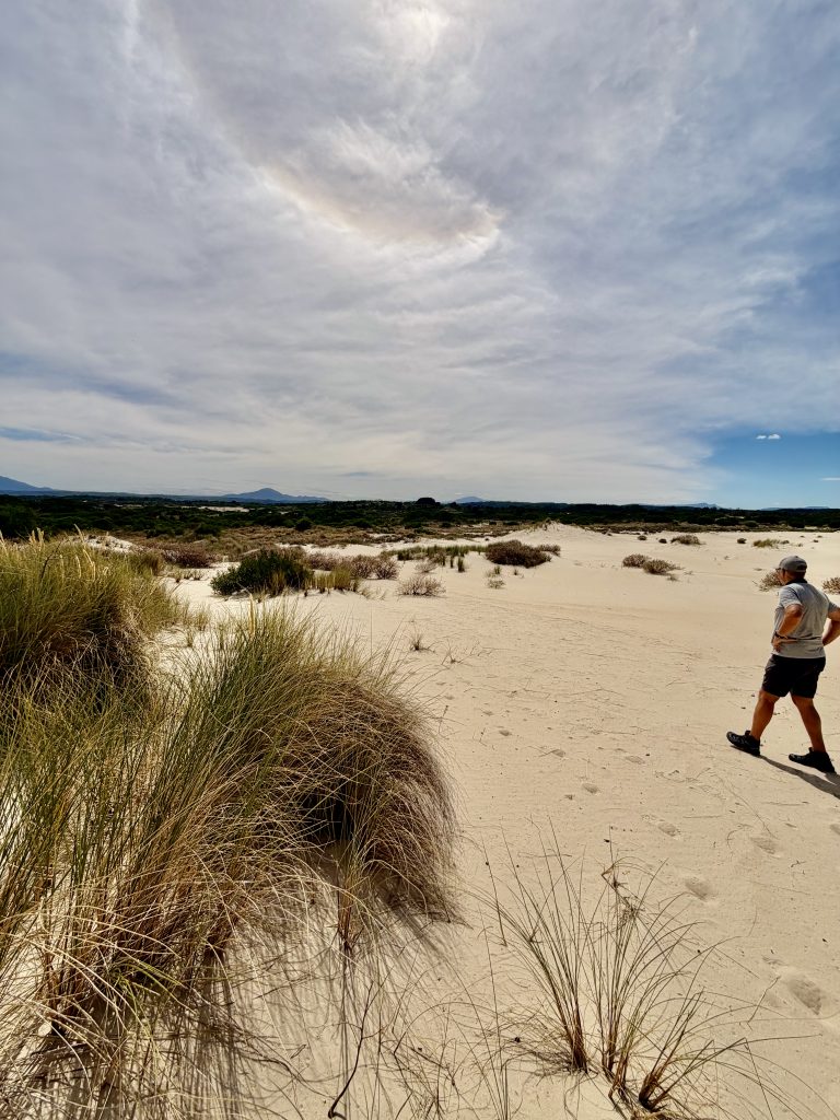 Wir wandern Dünen hoch und wieder runter, durch Dünengras hindurch, versinken im lockeren Sand und laufen auf festeren Stellen, dann auch schneller….