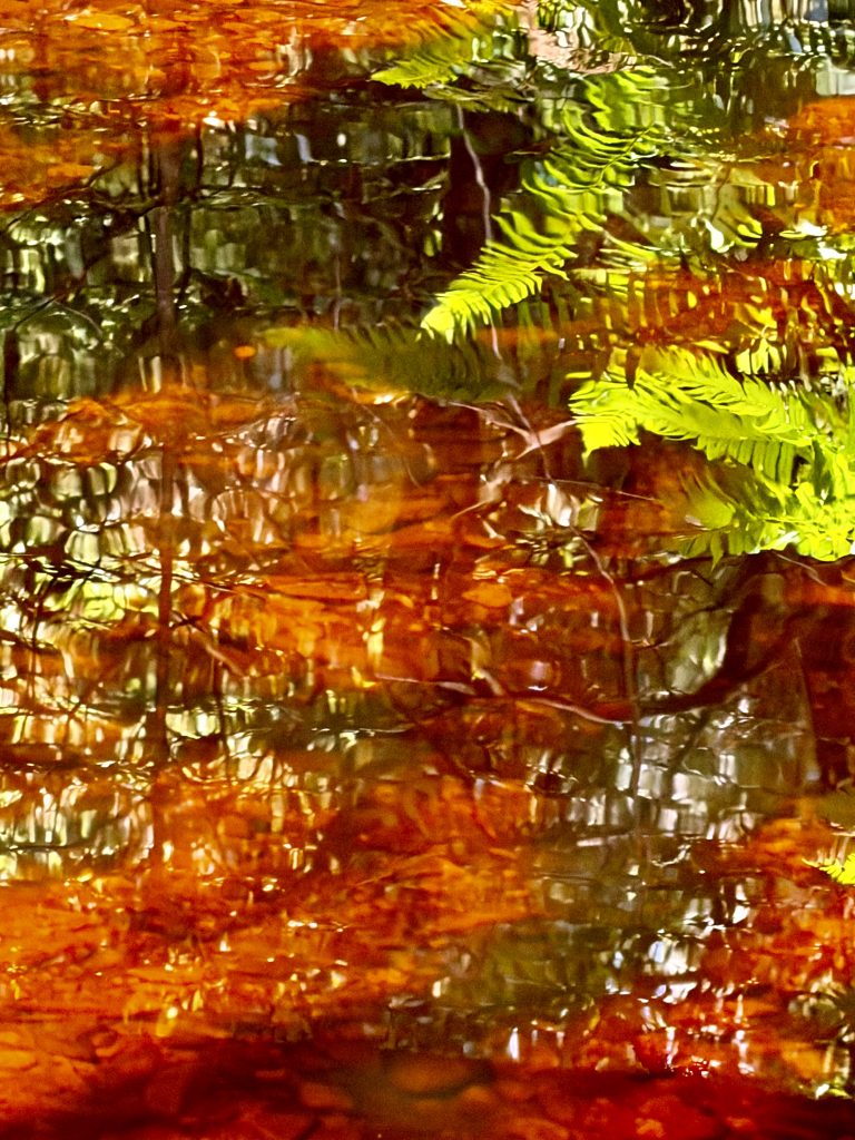 Leichten Schrittes nähern wir uns dem Wasserfall. Ein orange gefärbtes Bächlein begleitet uns bereits. Sind das Eisenpartikelchen, die dieses Orange erzeugen?