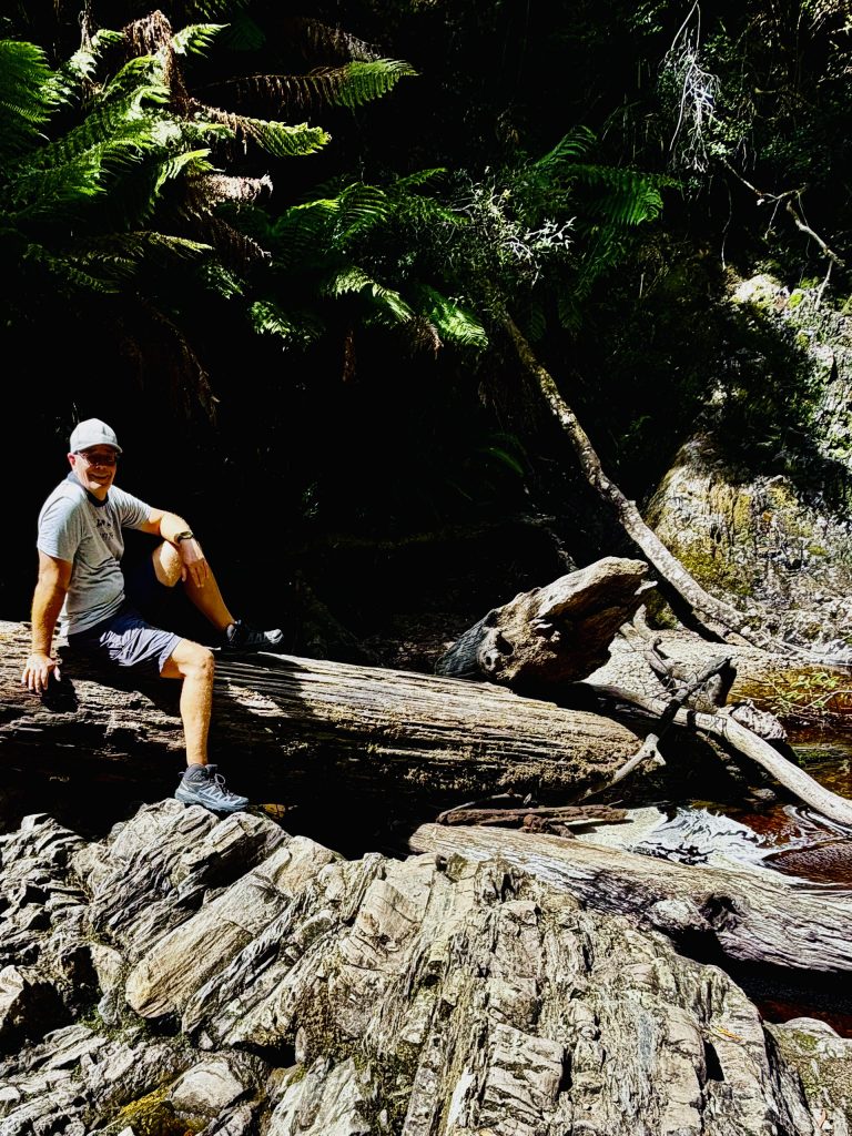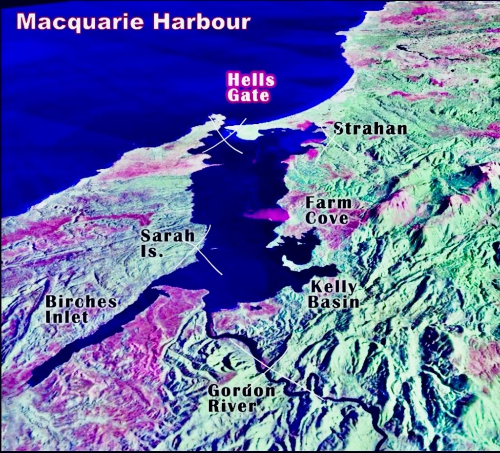 Nur mit Hilfe der obigen Karte kapiere ich im nachhinein, wo wir eigentlich langfahren. Von Strahan fahren wir zum Hells Gate, einmal durch und wieder zurück, dann in den Gordon River (Weltnaturerbe) und wieder zurück, zu Sarah Island und schließlich wieder zurück nach Strahan. Ahaaa…