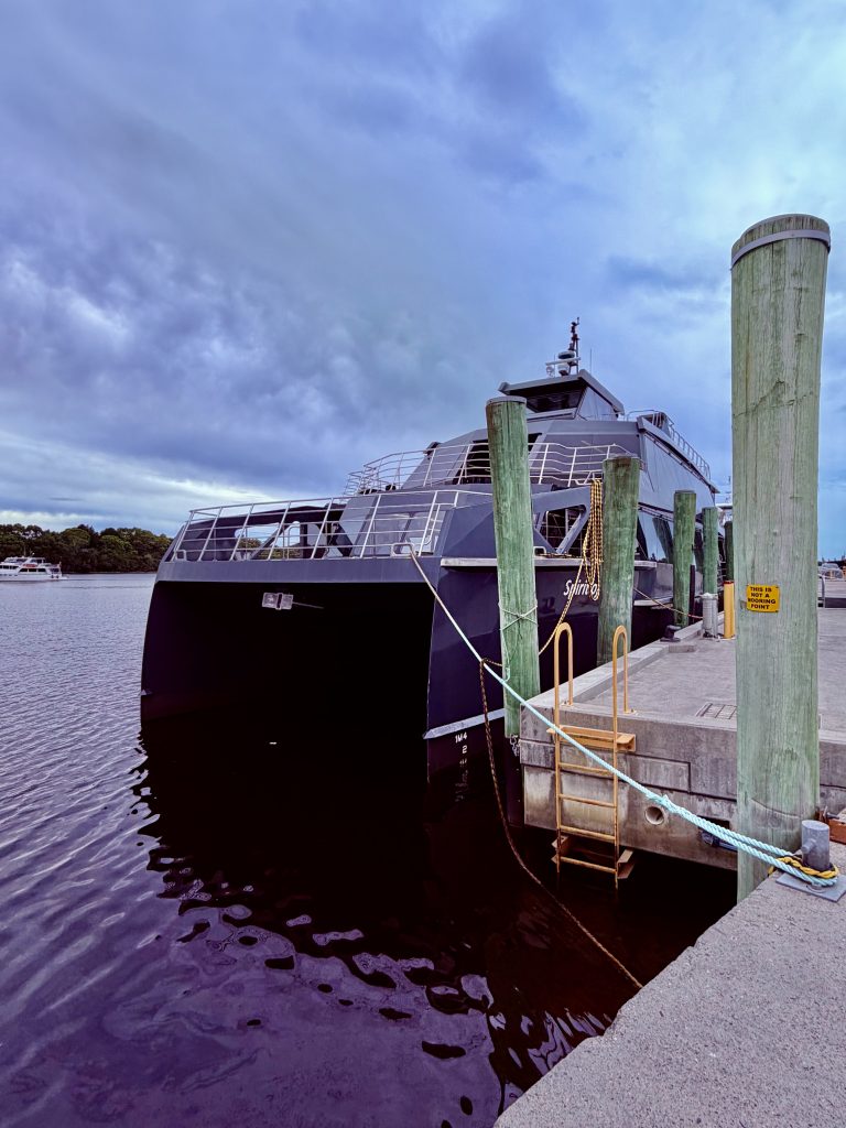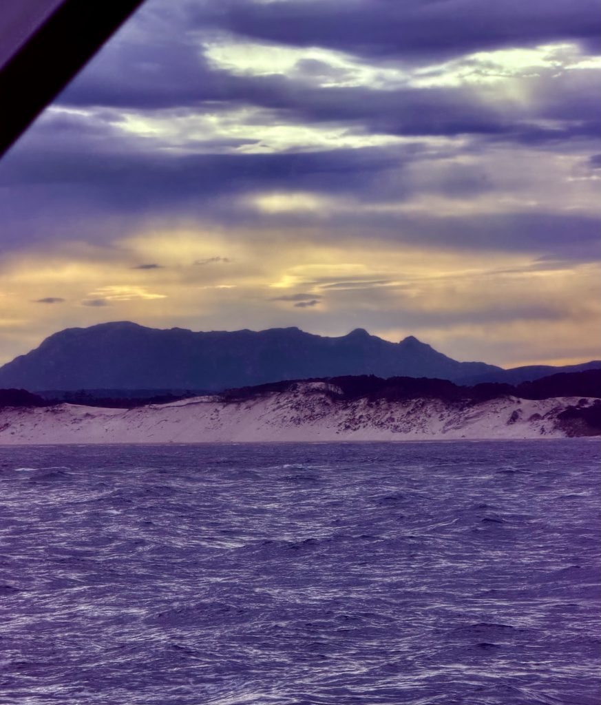 Und ganz plötzlich sind wir durchs Höllentor durch und auch schon wieder zurück. Scheiße, Ich hab’s gar nicht mitbekommen. Einmal Hölle und zurück ist komplett an mir vorbeigegangen. 🫣 Habe ich da gerade meinen Kakao geschlürft? Klaus sagt, er hat es mitbekommen, diese verdammt enge und flache Stelle, auf dem Plotter wohlgemerkt. Tja, er ist es ja auch gewohnt ununterbrochen auf den Plotter zu gucken. Da waren wohl nur noch ein paar Meter links und rechts und ganz wenig Platz unterm Boot bis zum Grund. Und das, wo heutzutage Bagger die Fahrrinne freihalten. Früher, im 19. Jahrhundert, havarierten die großen, unhandlichen Segelschiffe reihenweise, bei der Ein- oder Ausfahrt. Starke, unberechenbare Strömungen, ständig sich verändernde Sandbänke, schlechtes Wetter und Nebel machten eine sichere Durchfahrt nahezu unmöglich. So mancher Kapitän wartete Tage bis Wochen, um den “richtigen” Moment abzupassen. Warum mussten die da überhaupt durch? Nun ja, eine Alternative gab’s schlicht und einfach nicht. Die Westküste war und ist sehr, sehr rauh, felsig und unzugänglich. Die große Macquarie Bucht bot die einzige Möglichkeit zu ankern und Waren und Menschen zu transportieren. Macquarie Harbour war eben ein echter wirtschaftlicher Hotspot und Sarah Island eine wichtige Sträflingsinsel. Ahhh so war das.