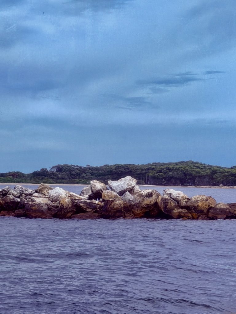 Dieser Steinwall wurde errichtet, um wirre Strömungen und Sandablagerungen von der Fahrrinne fernzuhalten. Und wer hat diesen Wall errichtet? Die Sträflinge natürlich. Eine echte Schweinearbeit, die bis heute dankbar genutzt wird.