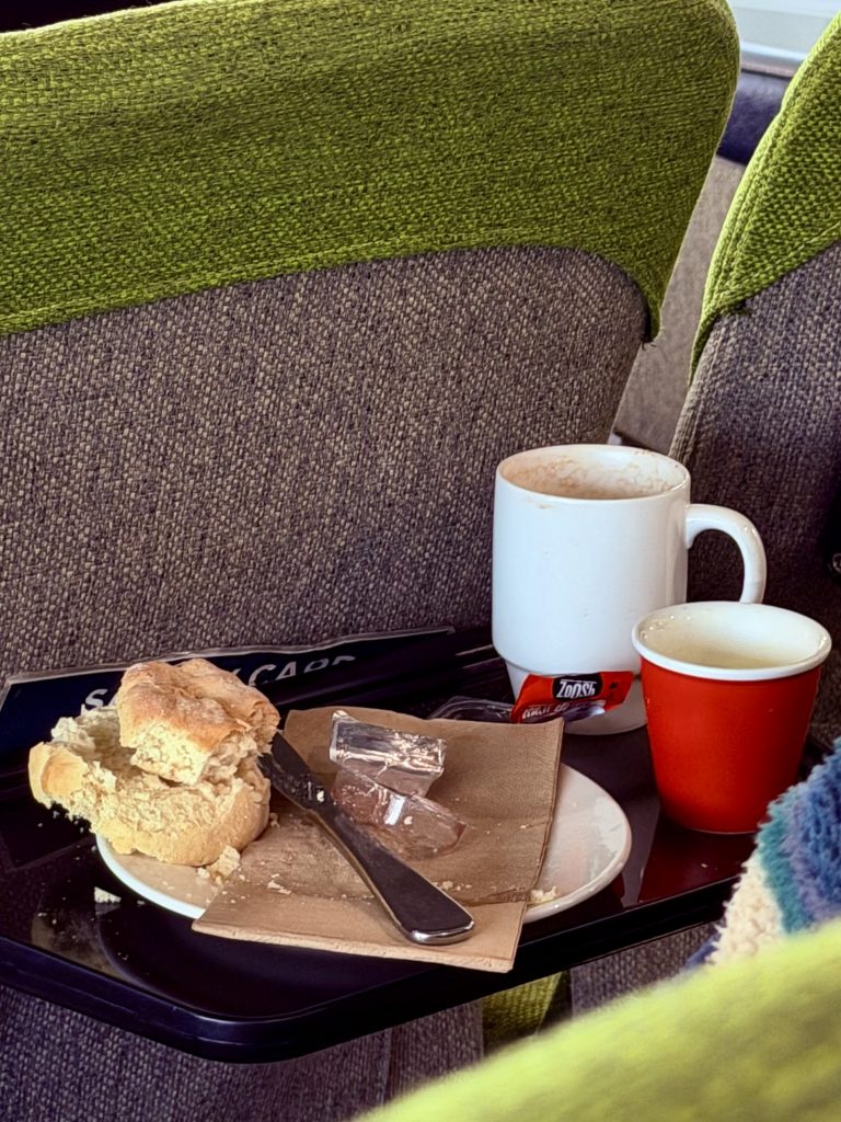 Aber ehrlich, wir gehören ja nun auch schon zum alten Eisen! Ich habe mich immer beömmelt, wenn sich meine jetzt wirklich hochbetagte Schwiegermama beklagte, dass hier und da ja nur alte Leute zugegen waren. Und sie??? Jetzt ertappe ich mich selber dabei. 🤫 Nun, der Ausflugskat ist modern, ordentlich und bequem, die Theke ist eröffnet und viele holen sich erstmal einen Kaffee oder ein Frühstück. Ich hole mir ne heiße Schokolade, ein Wasser und nen Obstsalat. Klaus darf auch was abhaben.
