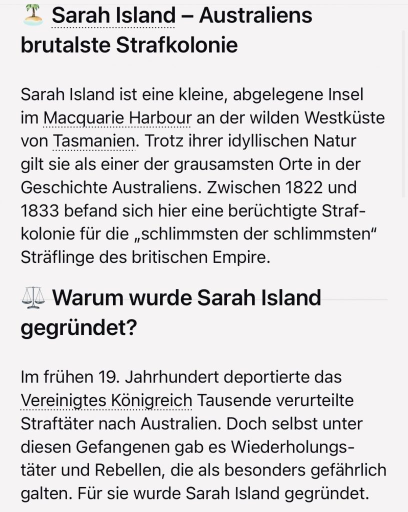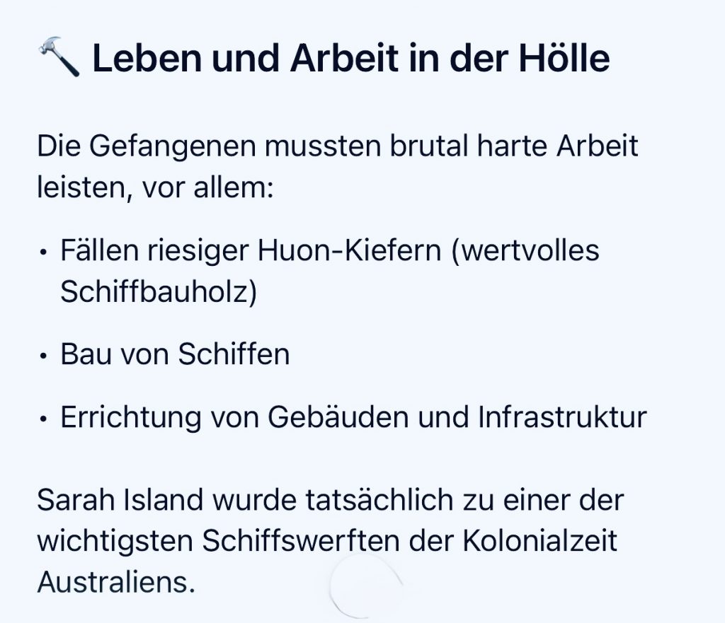 Der spektakulärste Ausbruch gelang einigen Männern mit dem Klau des Schiffes Frederick. Die Frederick wurde auf Sarah Island gebaut, die Männer überwältigen die Wachen, kamen erfolgreich durchs Höllentor, segelten nach Chile und gaben sich dort als gestrandete Seeleute aus. Unglaublich aber wahr, wurden die meisten, nicht alle, dort erkannt und erneut gefasst. Echt tragisch, möchte ich sagen. 🫩