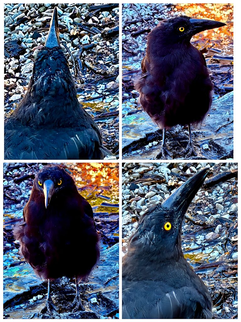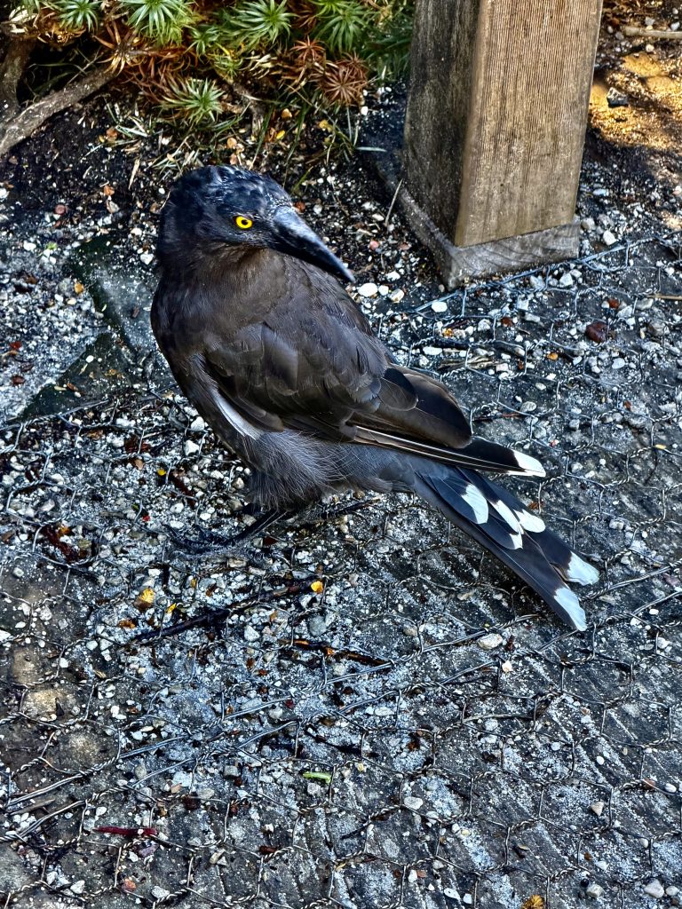 Also, der ist nur verwandt mit den Raben, er gehört nicht zur Kernfamilie, das habe ich gerade gelernt. Seine Familie sind die Stare, und im speziellen ist er ein Weißbürzel-Krähenstar. Und Bürzel ist nichts am Kopf sondern am Popo. Eine weiße Stelle unter dem Schwanz. Daneben hat er noch schöne, weiße Halbmonde an den Schwanz- und Flügelspitzen und stechend gelbe Augen.