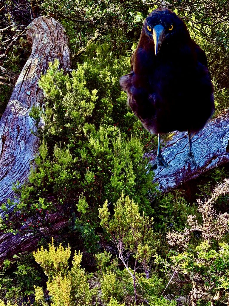 Wir machen ein kleines Bananen- und Apfelpäuschen und haben ein Tête à Tête mit einem Rabenvogel. Die schlauen unter den Vögeln.